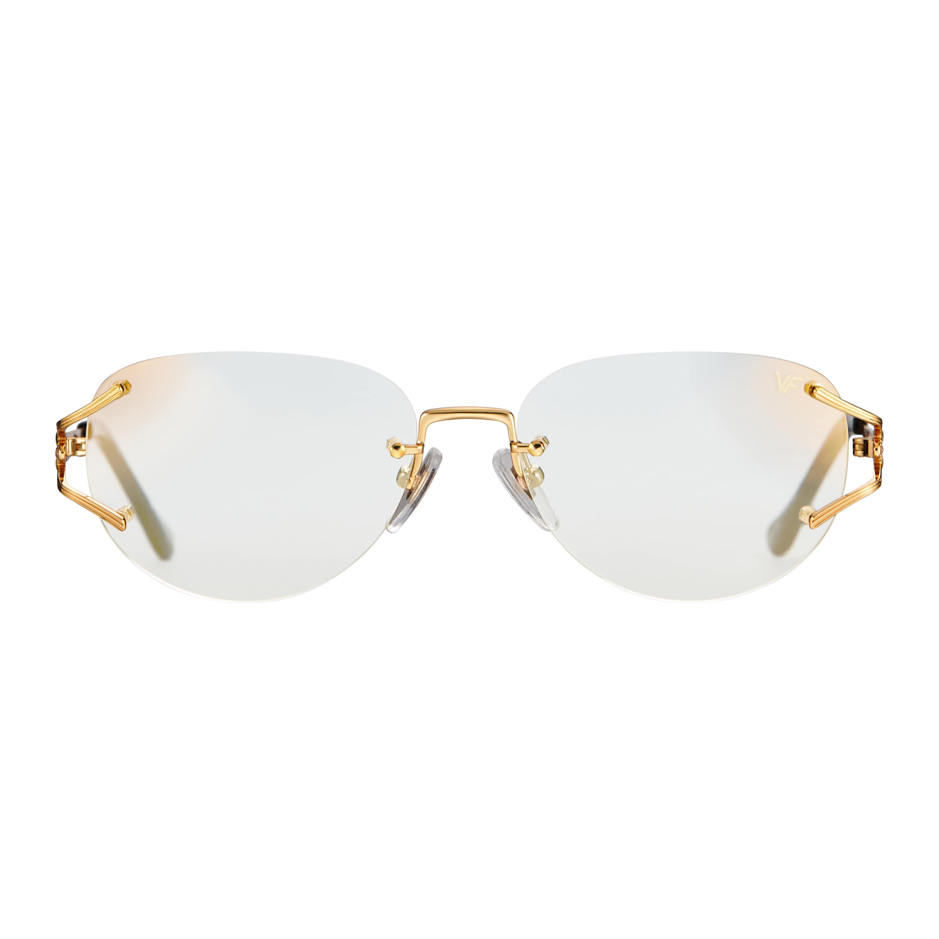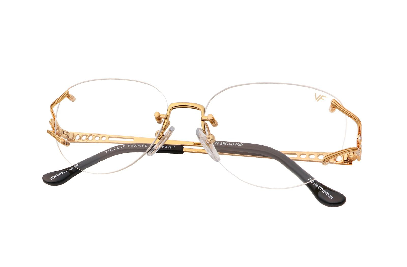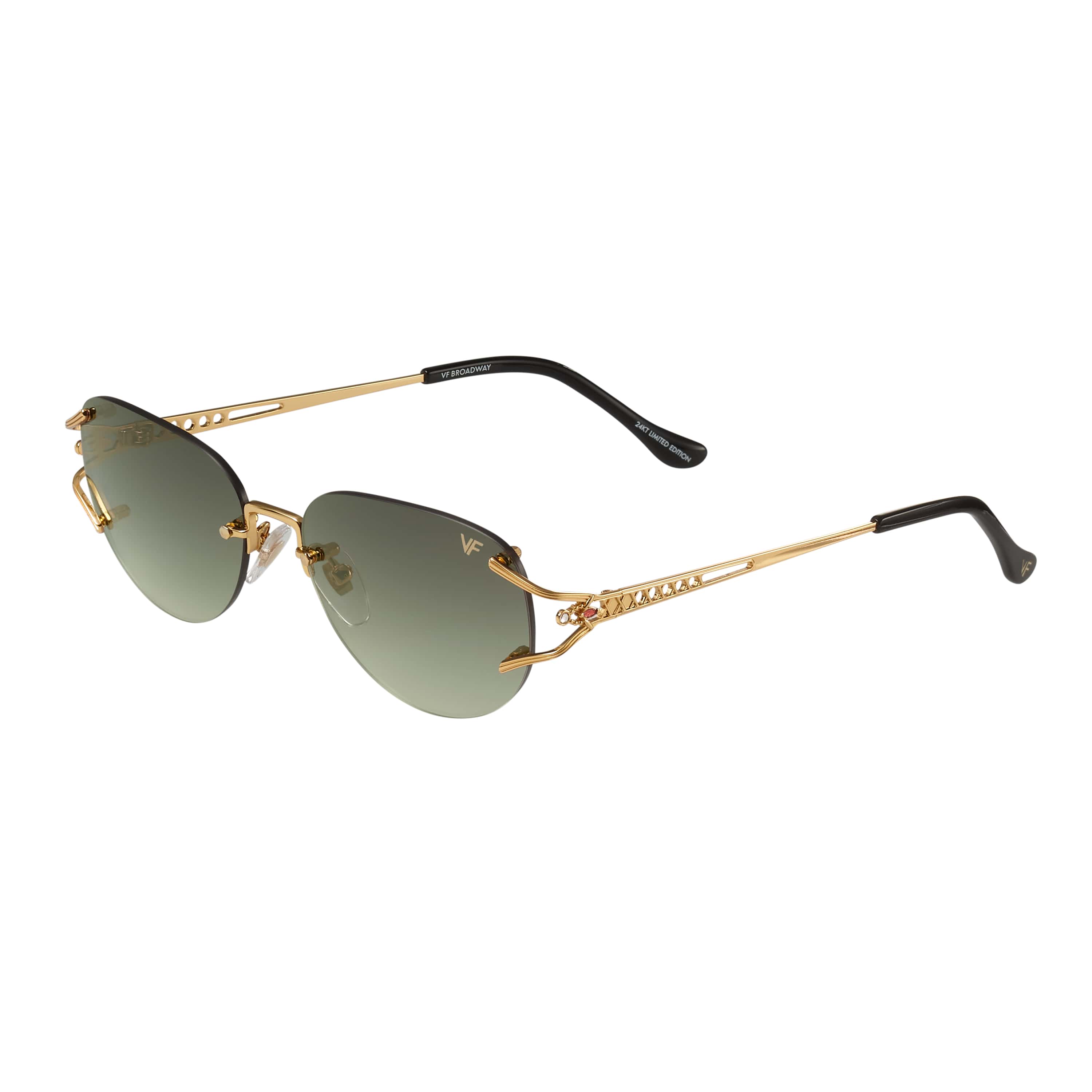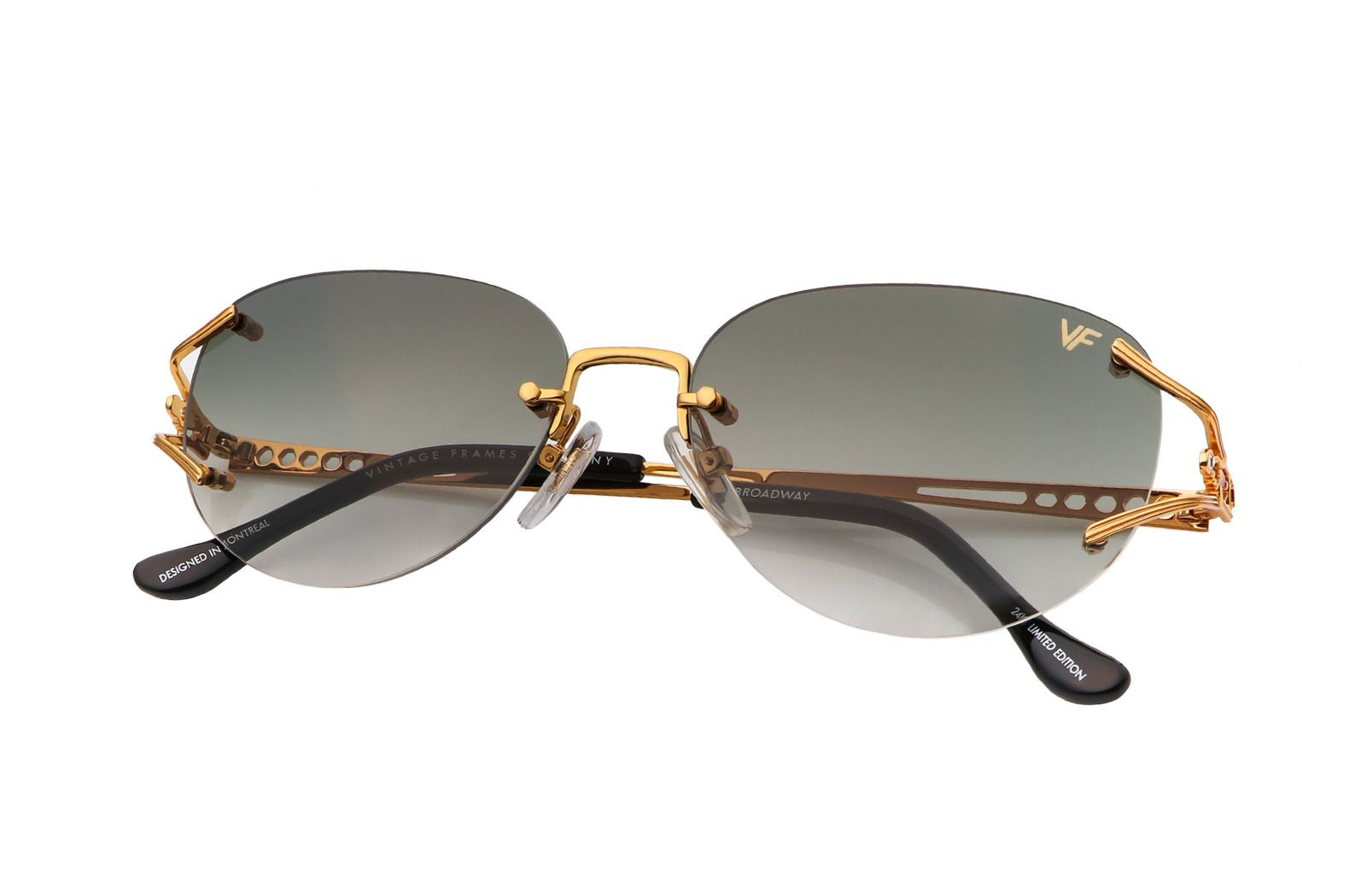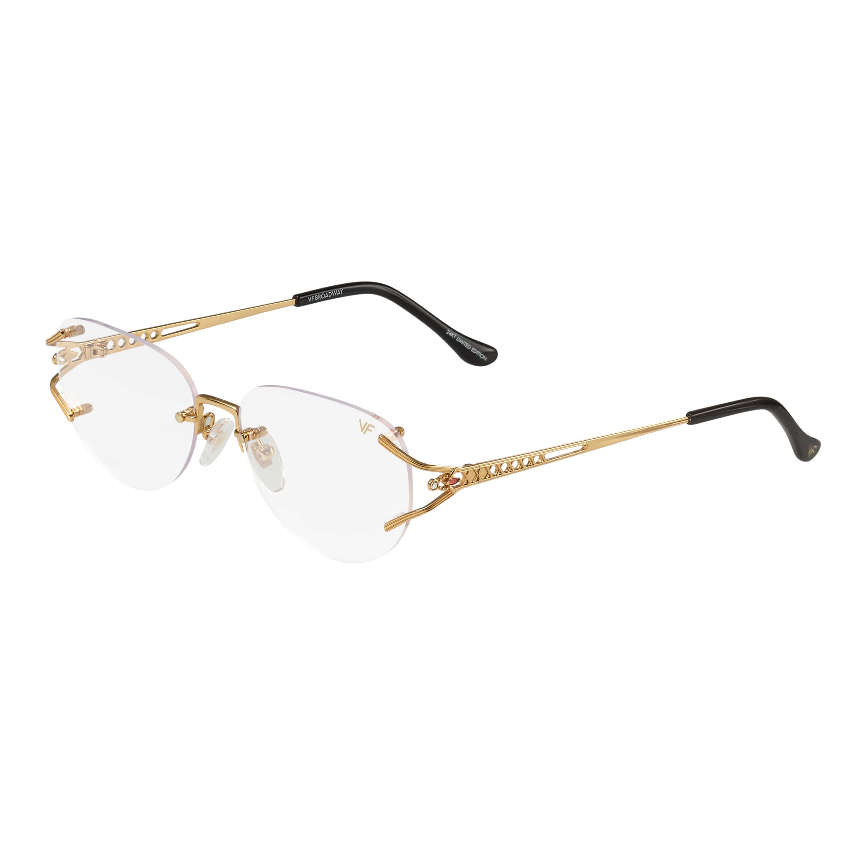 The Broadway is our first drill mount released in Spring Summer 2024. The round custom color lenses are mounted by 24KT gold butterfly pattern temples with crystal detailing, inspired by the iconic double-deck Broadway Bridge in New York City. This frame is designed with special posts mounted on the lenses; making this frame great for both sun and optical.