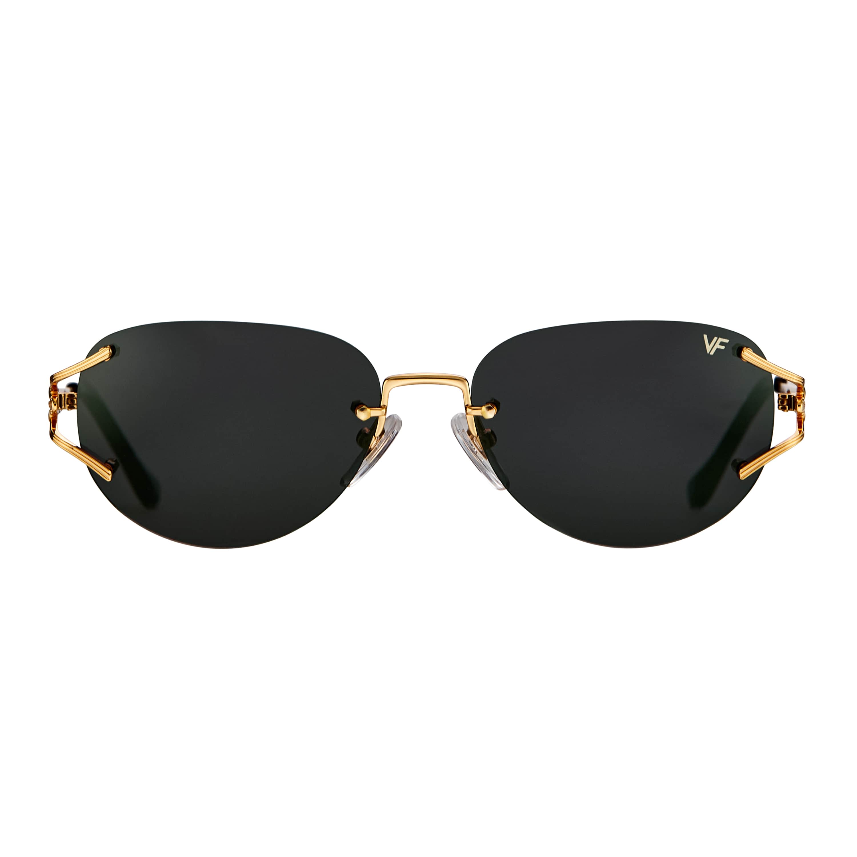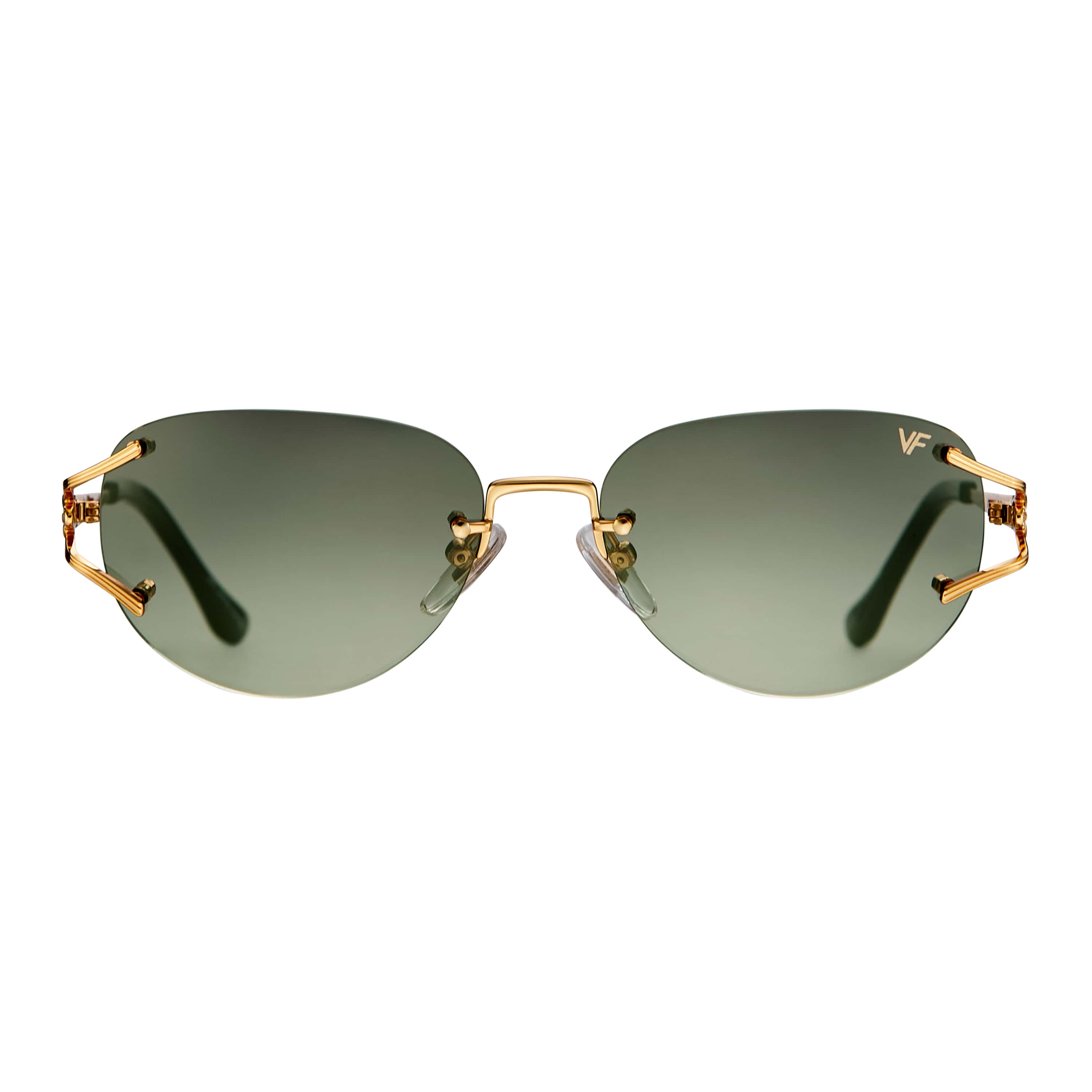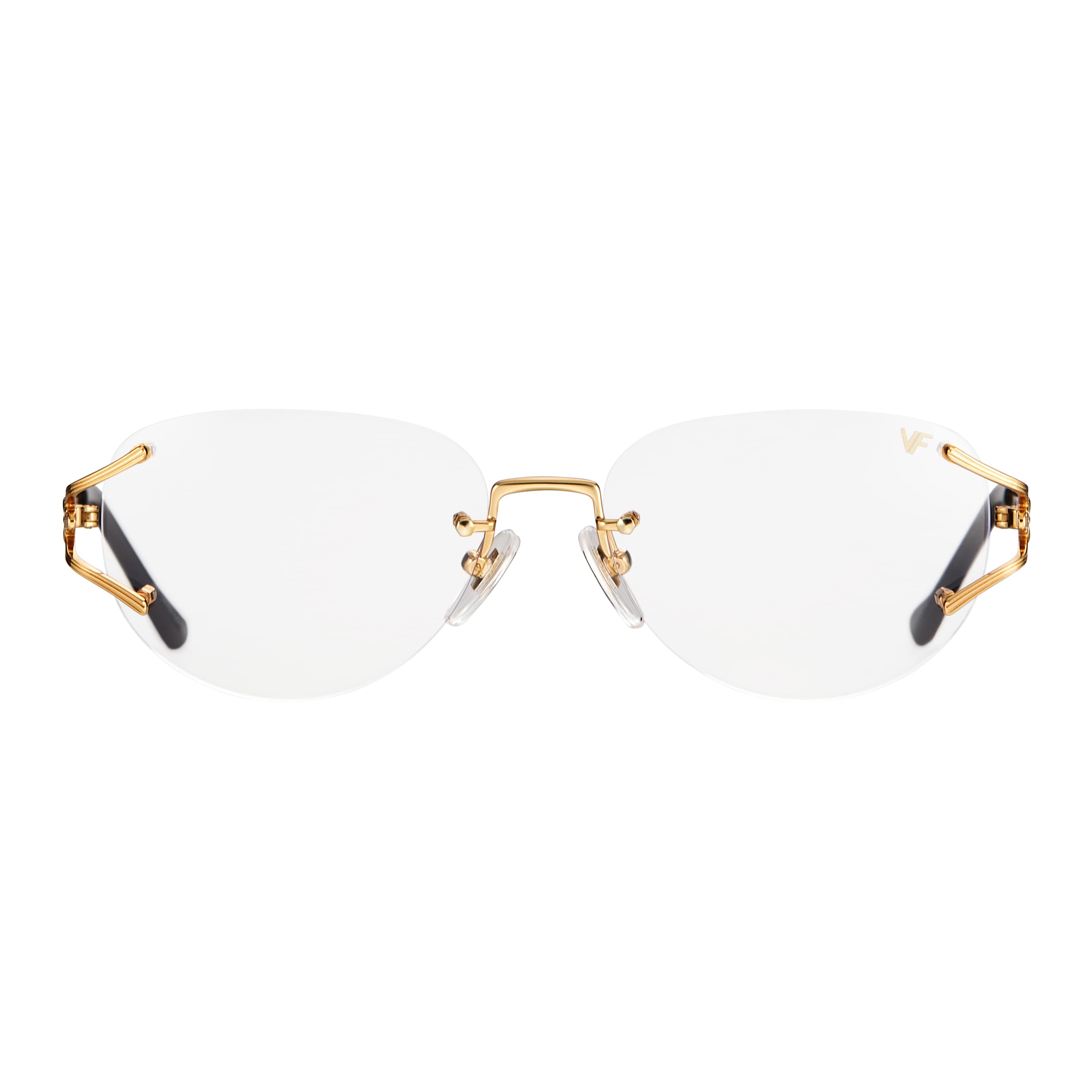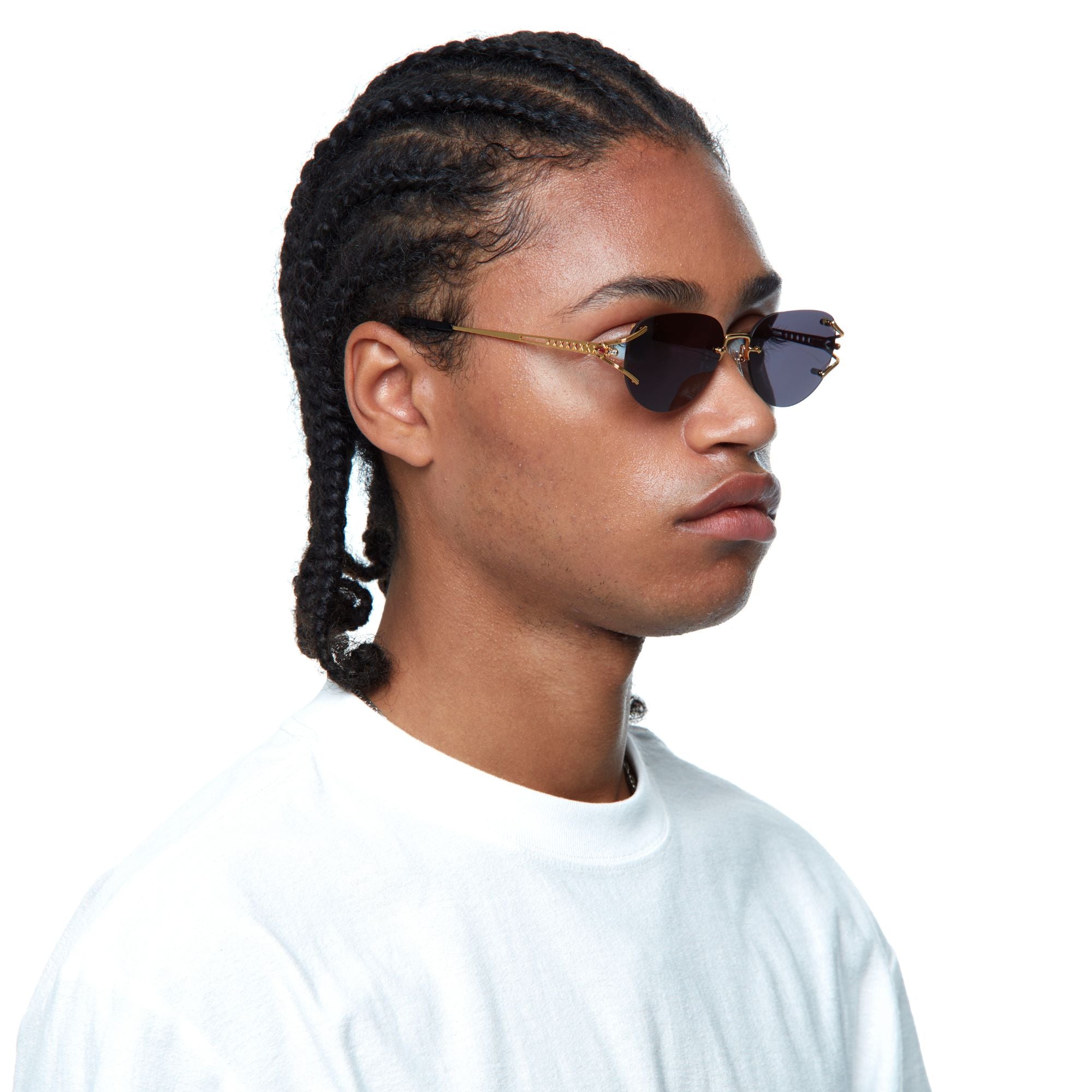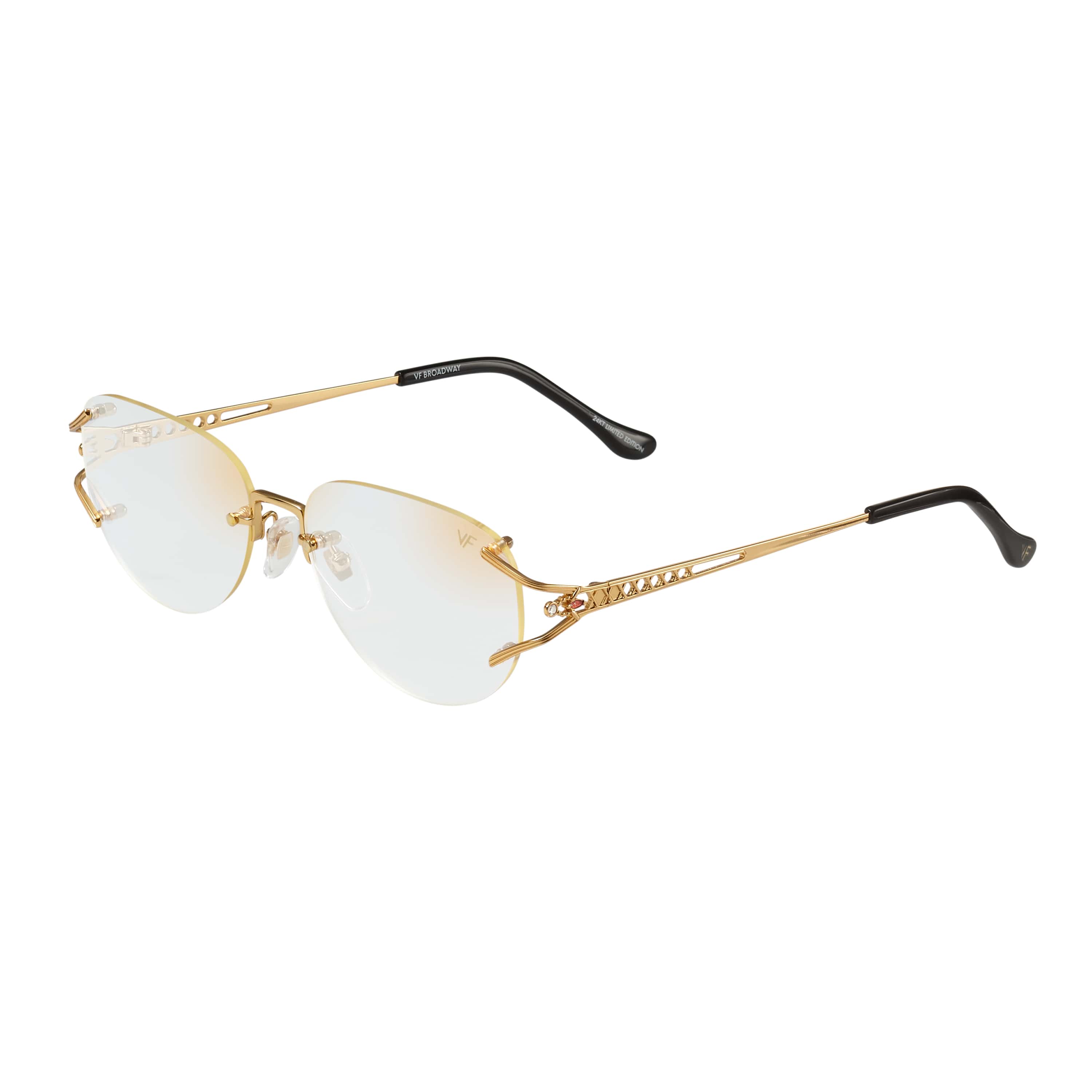 The Broadway is our first drill mount released in Spring Summer 2024. The round custom color lenses are mounted by 24KT gold butterfly pattern temples with crystal detailing, inspired by the iconic double-deck Broadway Bridge in New York City. This frame is designed with special posts mounted on the lenses; making this frame great for both sun and optical.