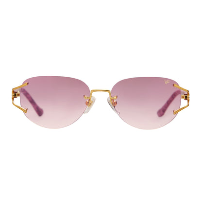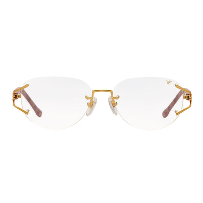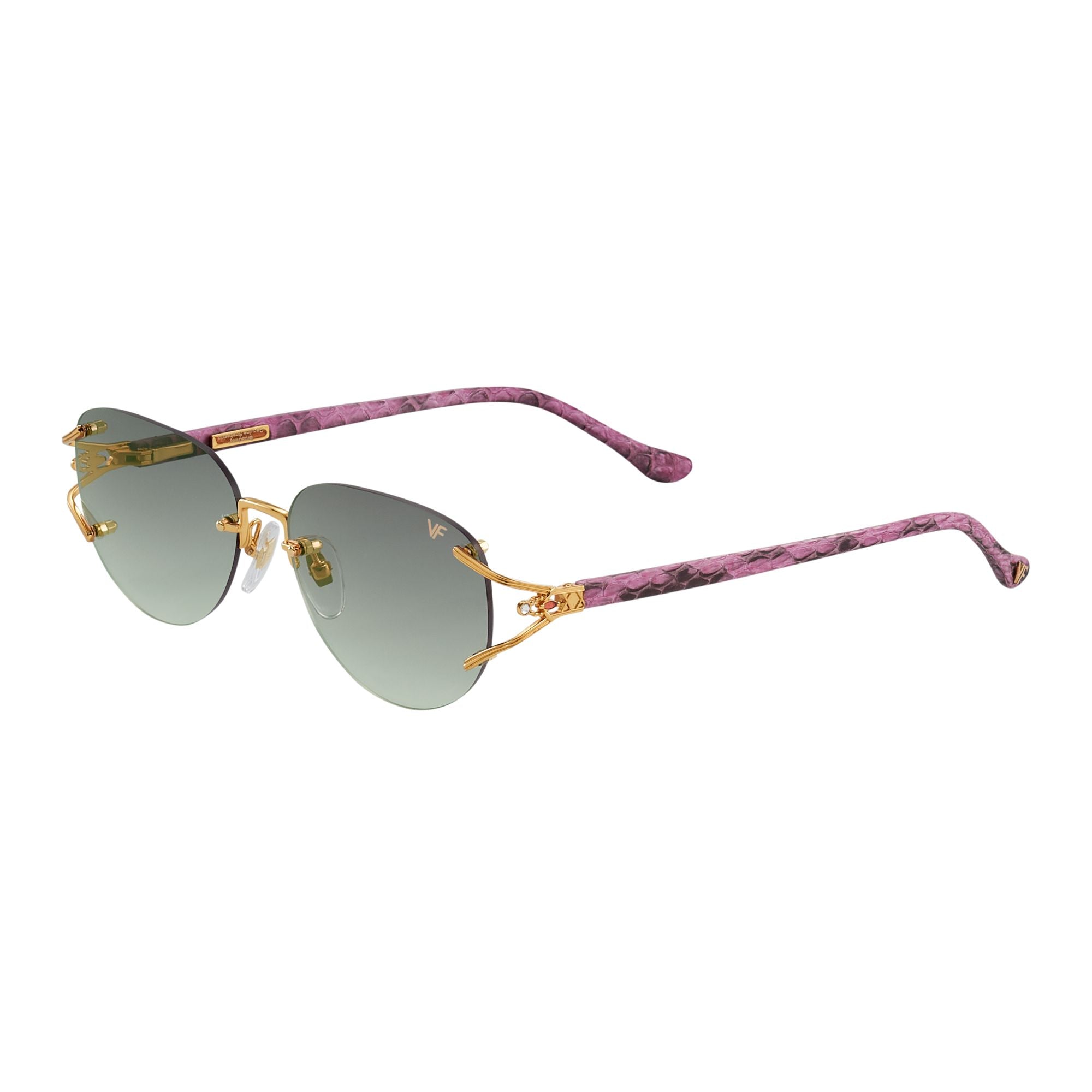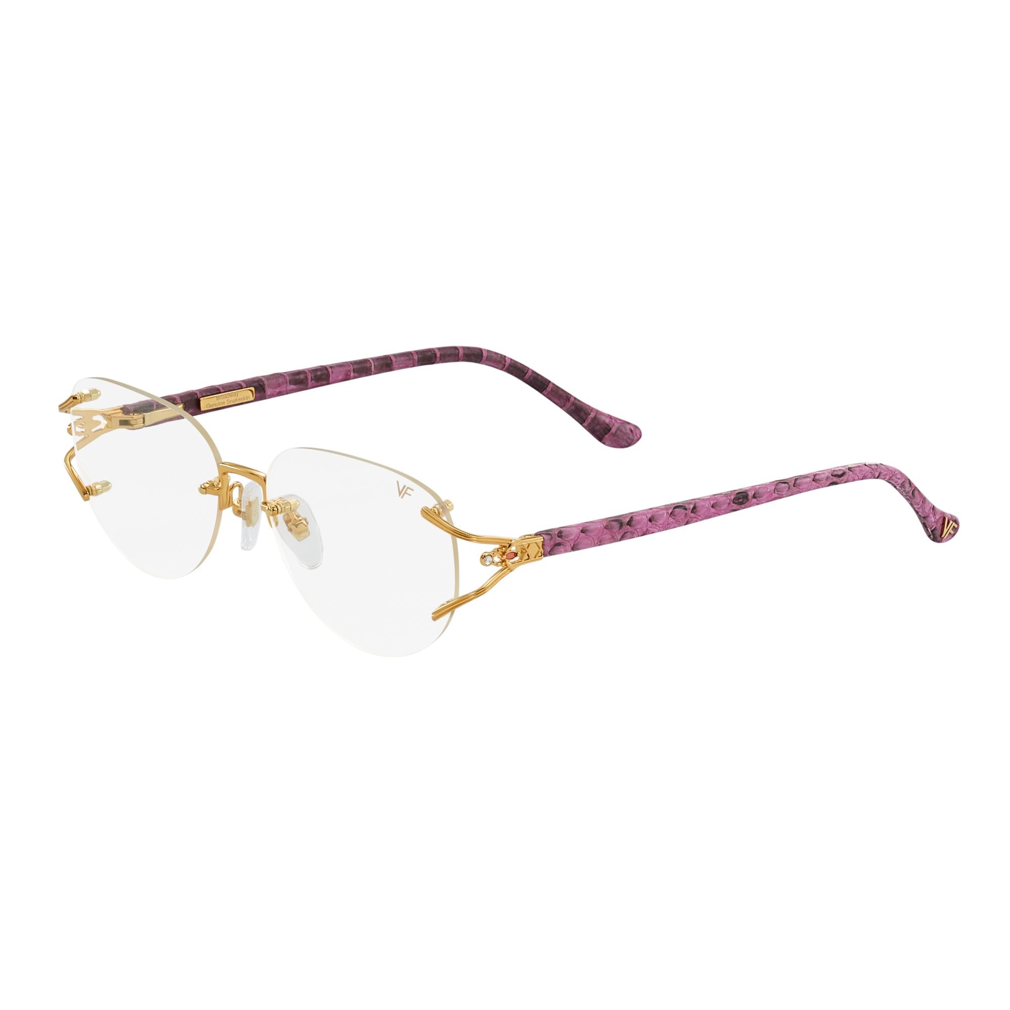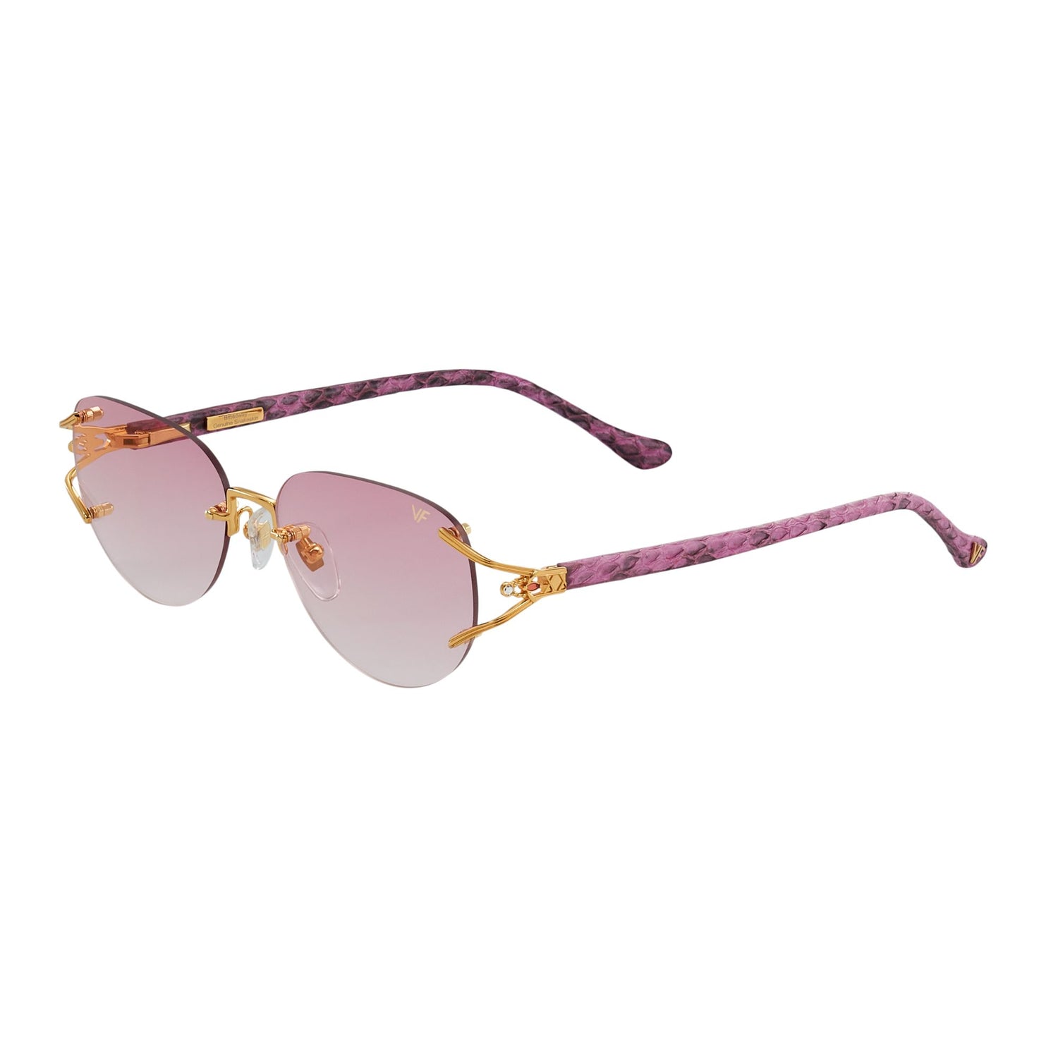 Introducing the Broadway Snakeskin edition. The round custom color lenses are mounted by 24KT gold butterfly pattern temples with crystal detailing, inspired by the iconic double-deck Broadway Bridge in New York City. This frame is designed with special posts mounted on the lenses; making this frame great for both sun and optical.