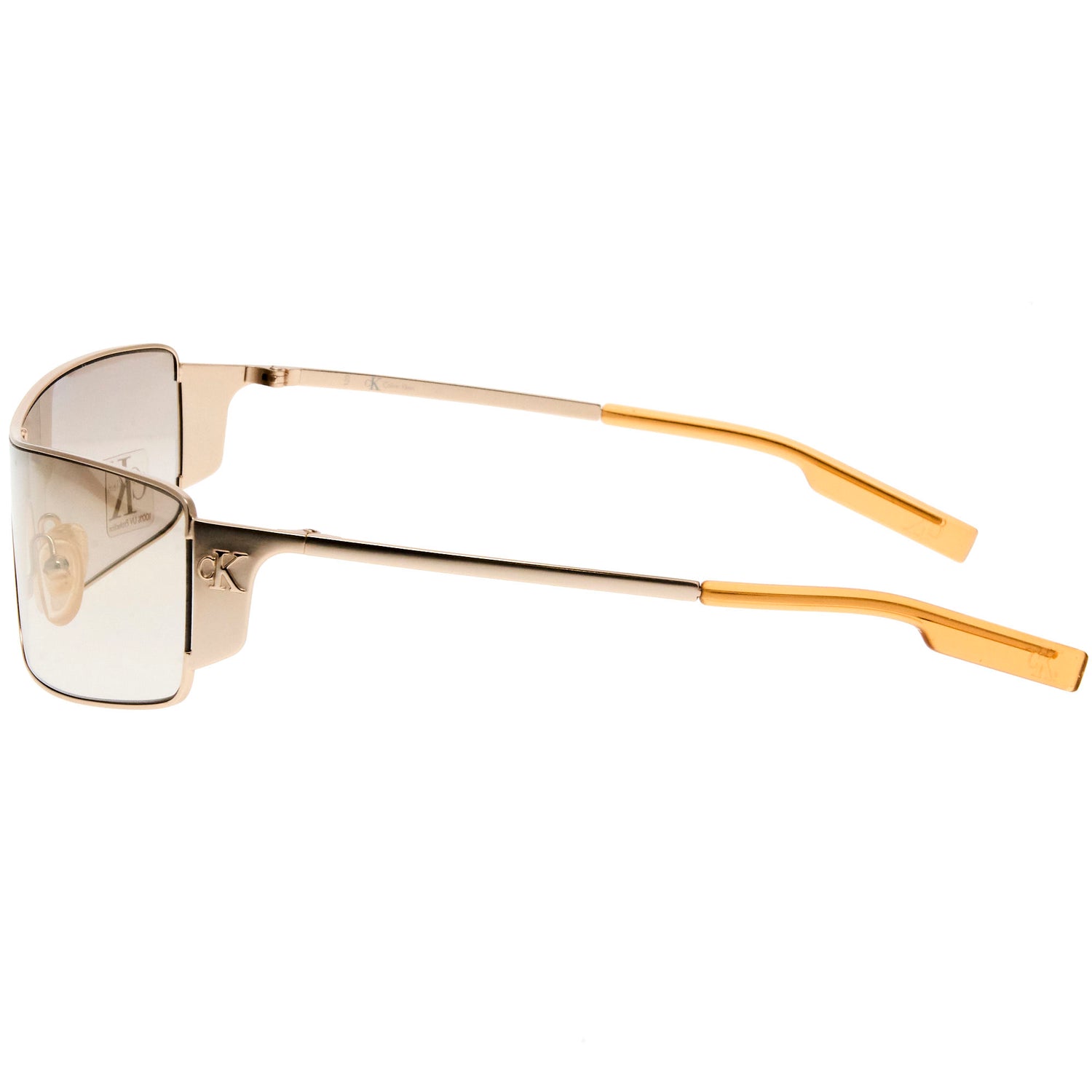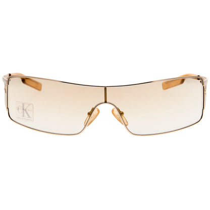 The Calvin klein 2045 181 sunglasses, with its gold/orange frame and iconic shield silhouette, is a rare vintage sunglasses find for collectors.