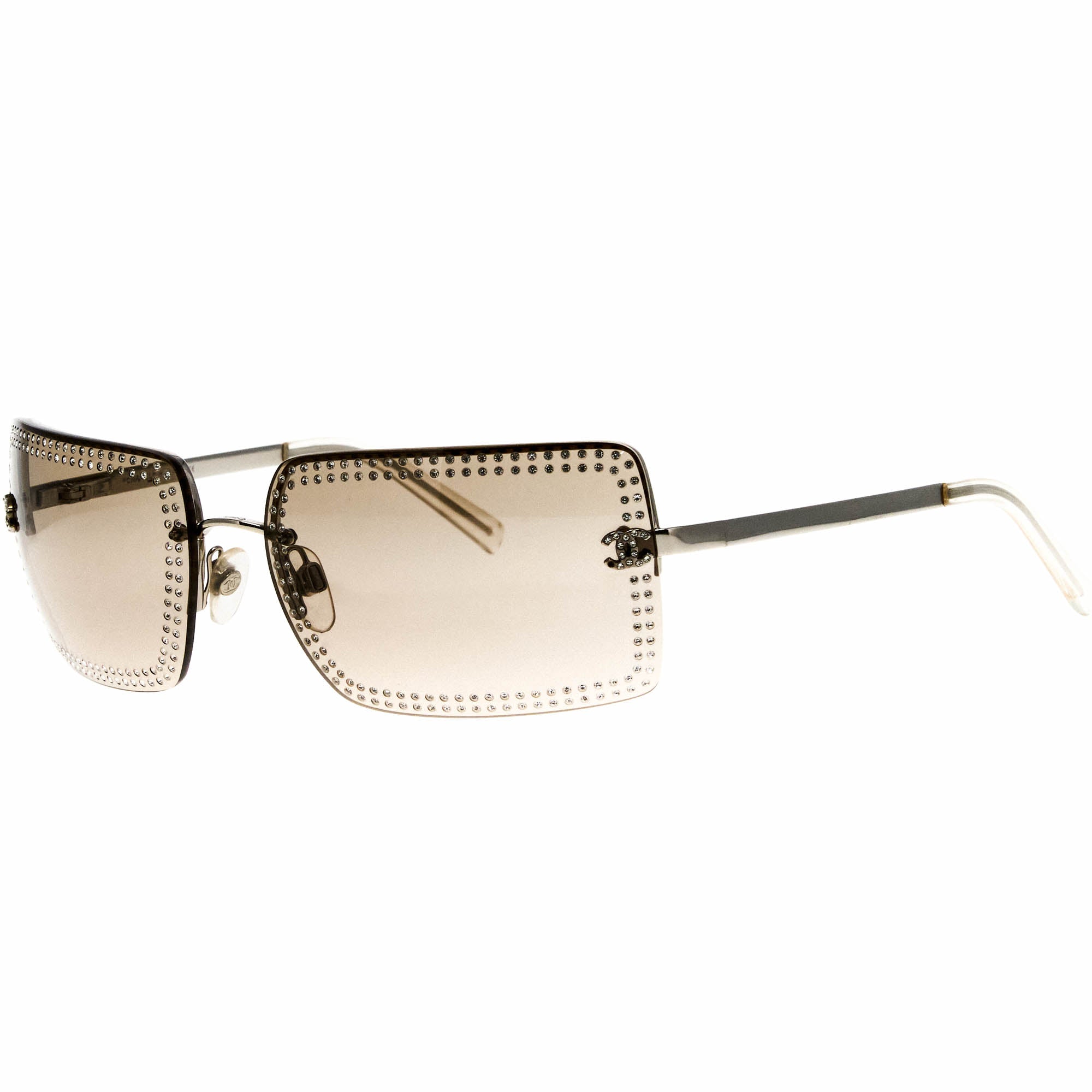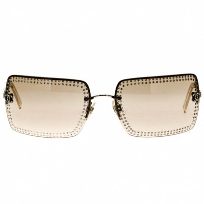 The Chanel 4105B 124 79 2 sunglasses, with its silver frame and iconic half rim silhouette, is a rare vintage sunglasses find for collectors.