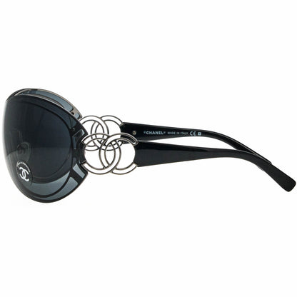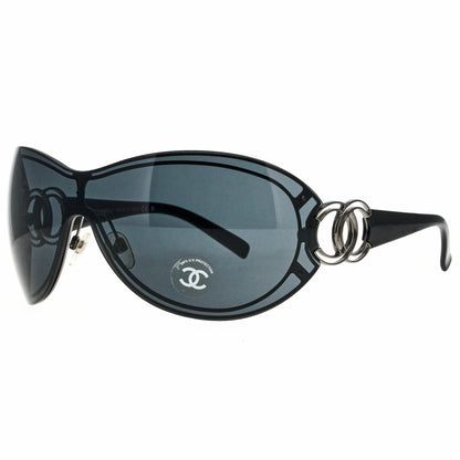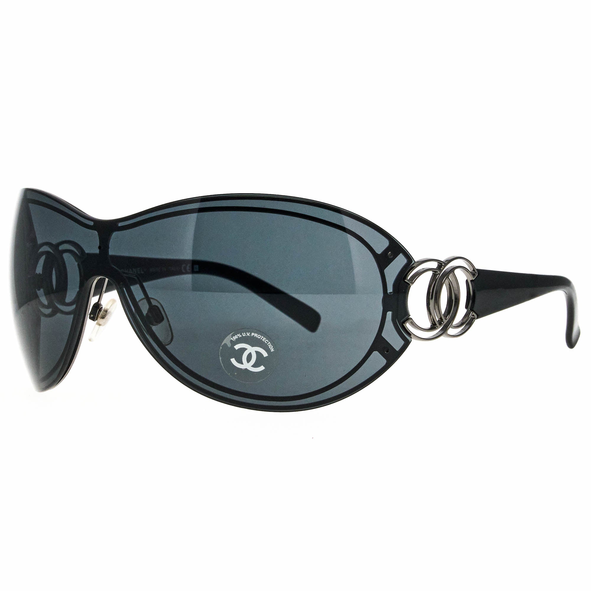 The Chanel 4144 108 87 sunglasses, with its silver/black frame and iconic shield silhouette, is a rare vintage sunglasses find for collectors.