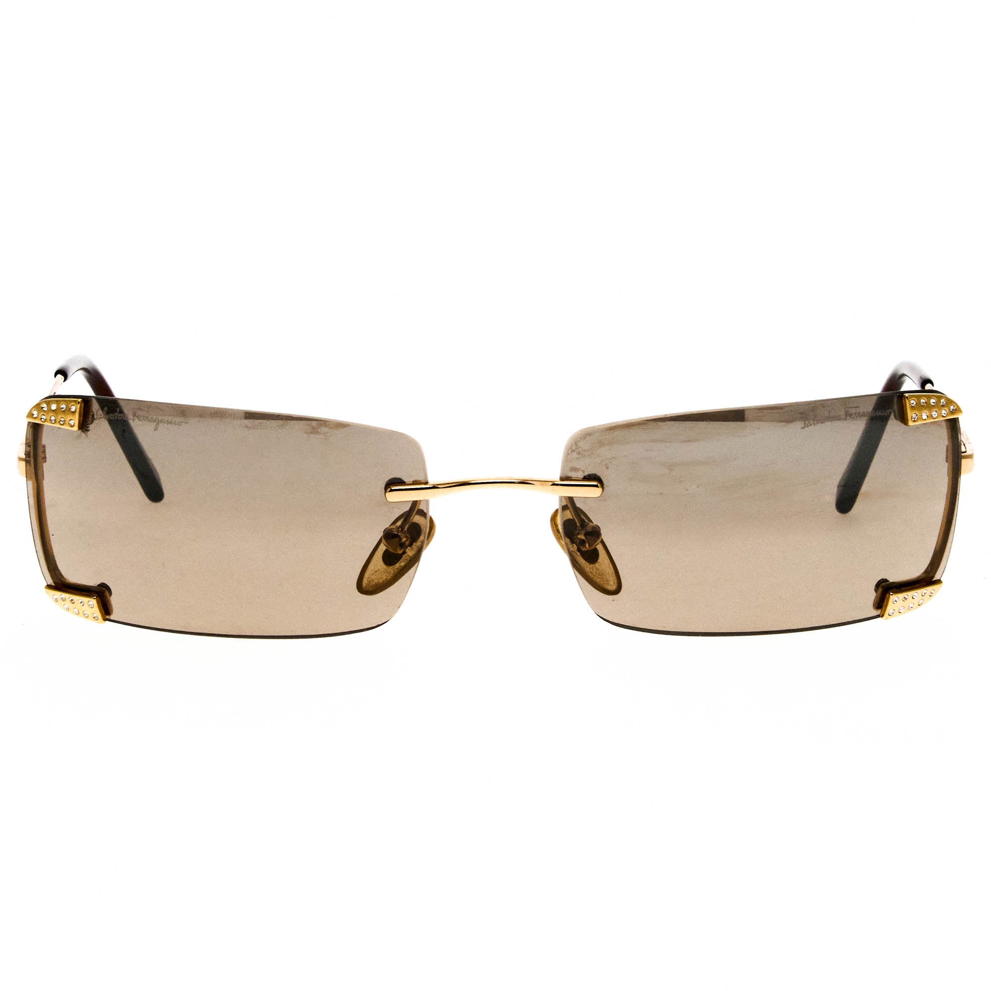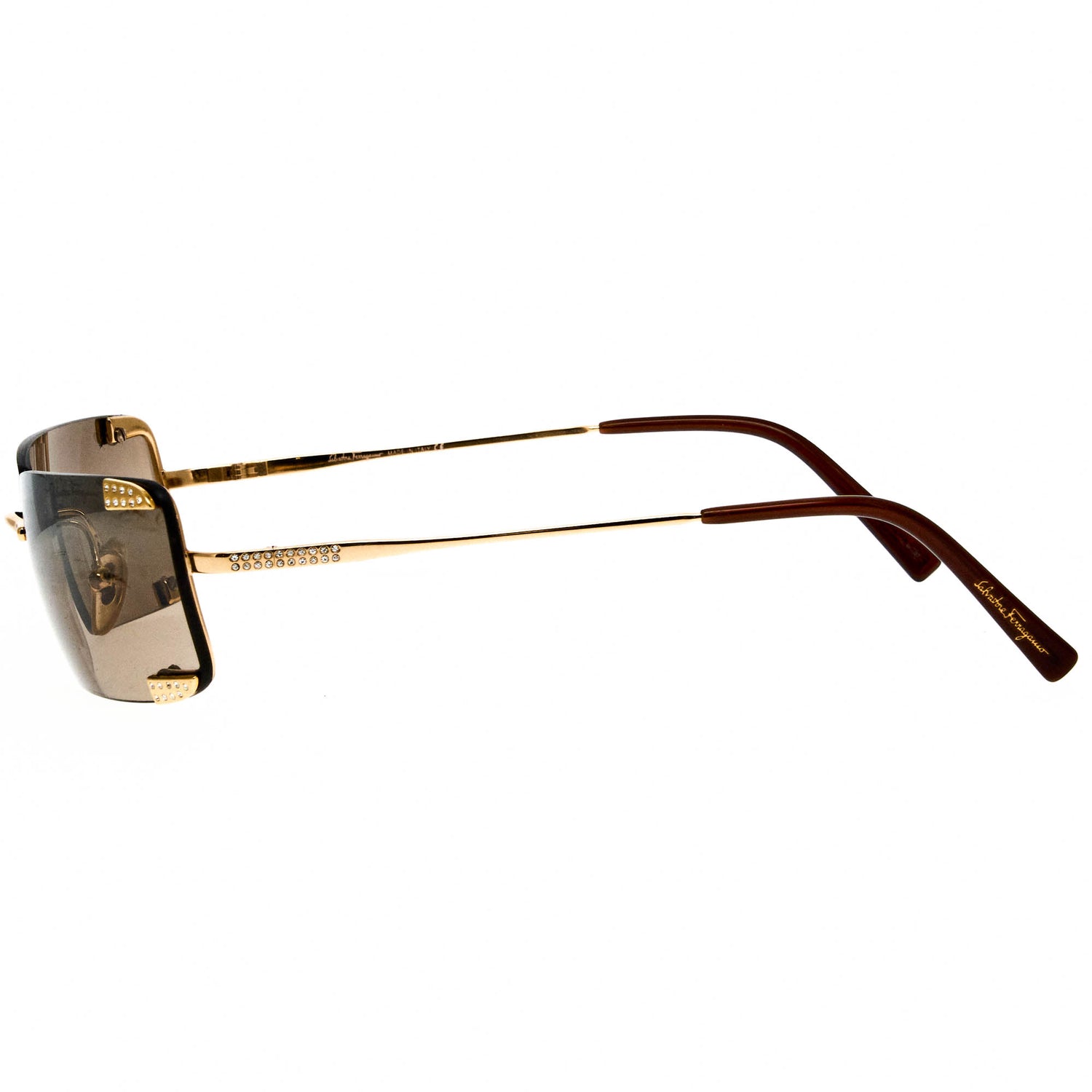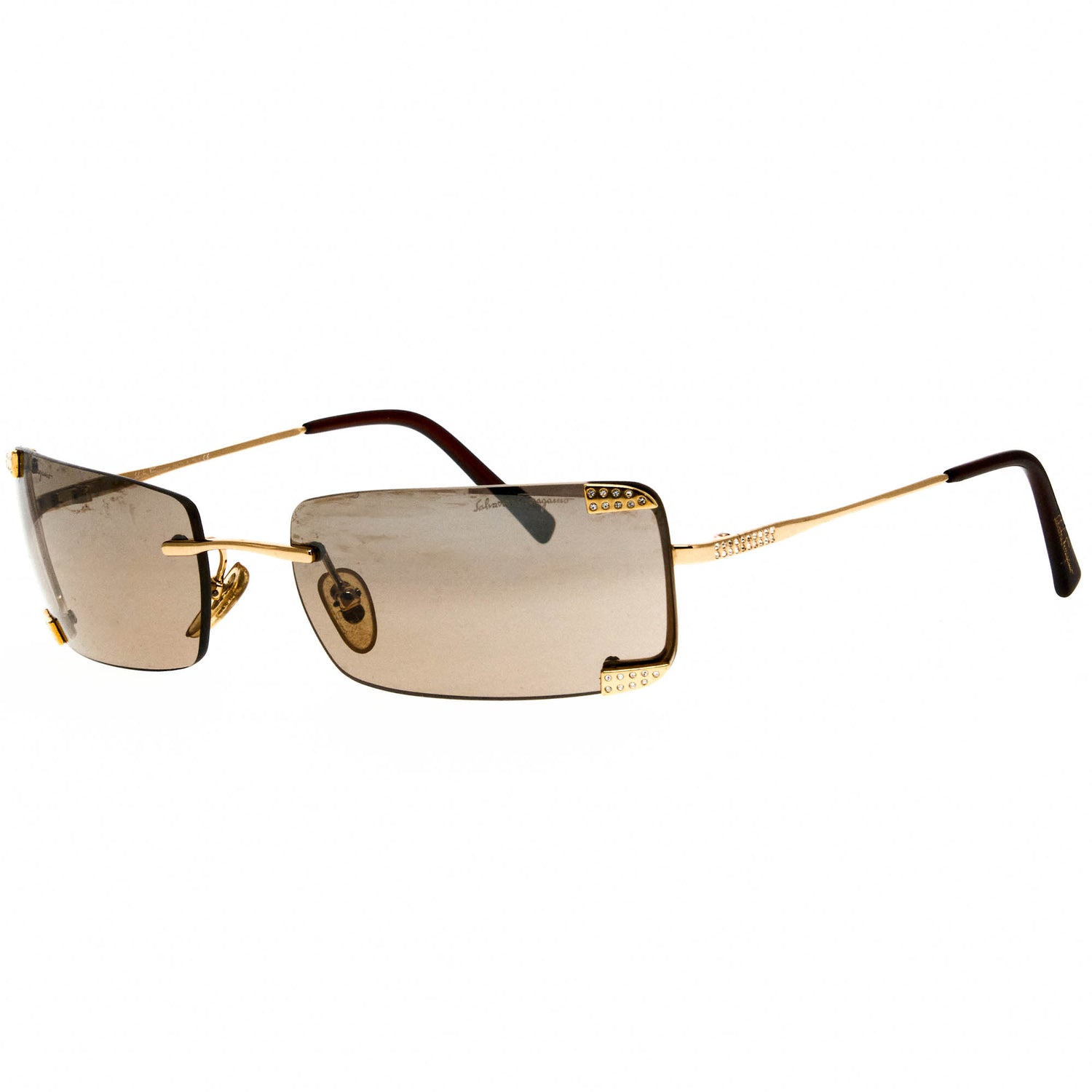 The Ferragamo 1043B 509 54 vintage sunglasses, with its gold frame and iconic rectangular silhouette, is a rare vintage sunglasses find for collectors.