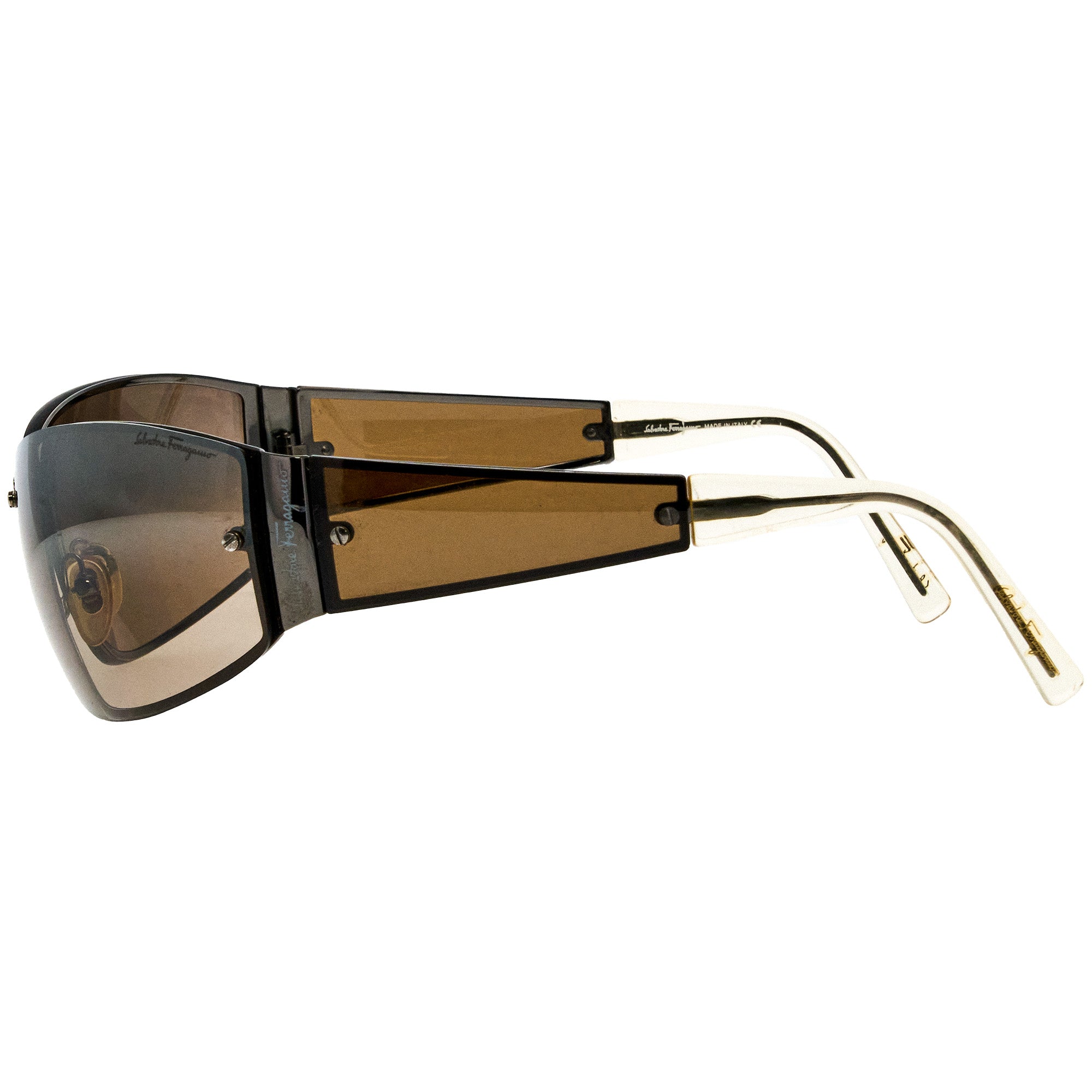 The Ferragamo 1050 502 54 vintage sunglasses, with its silver/brown transparent frame and iconic rectangular silhouette, is a rare vintage sunglasses find for collectors.