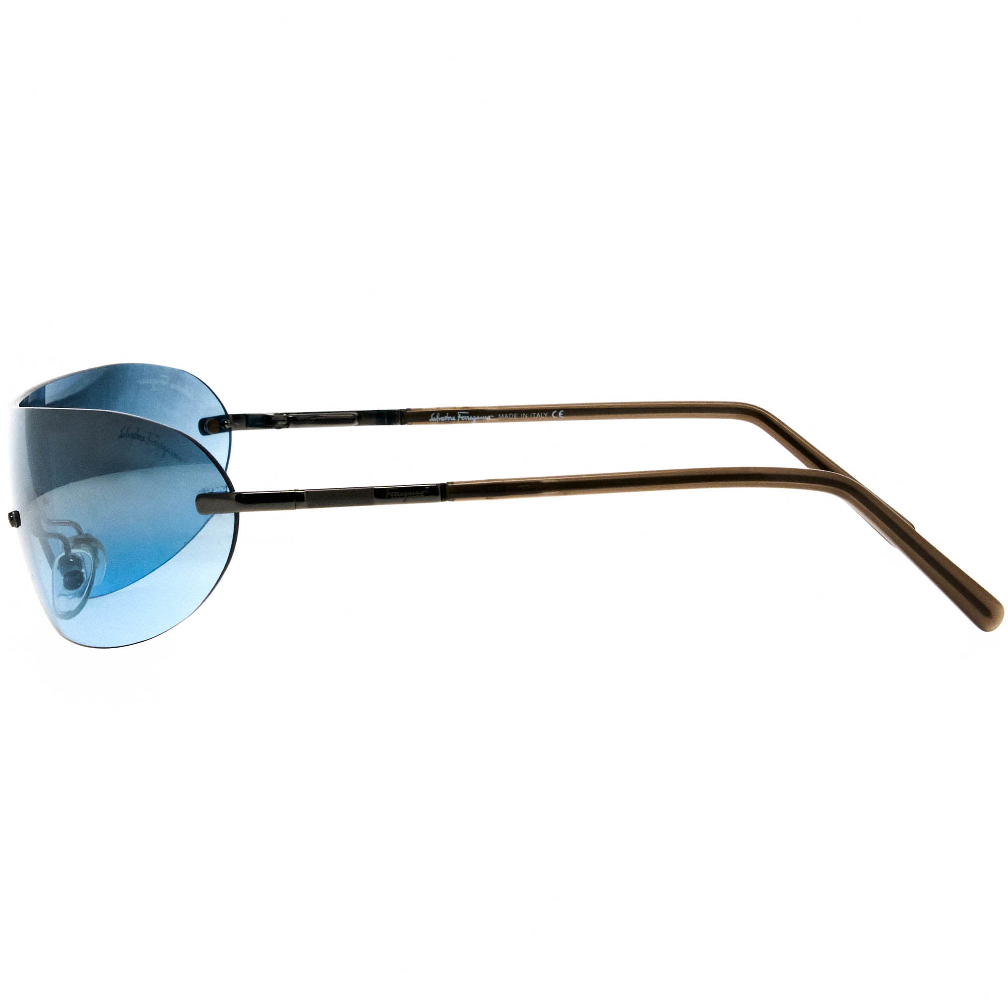 The Ferragamo 1073 502 7C 120 vintage sunglasses, with its black frame and iconic shield silhouette, is a rare vintage sunglasses find for collectors.