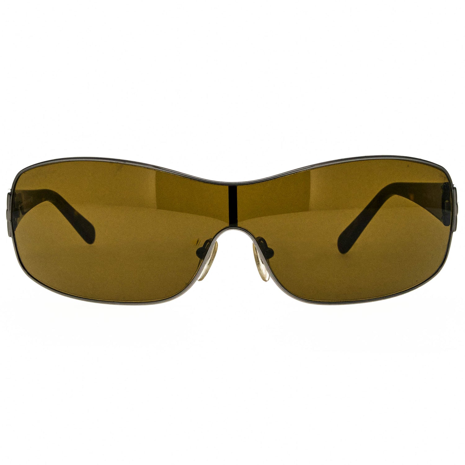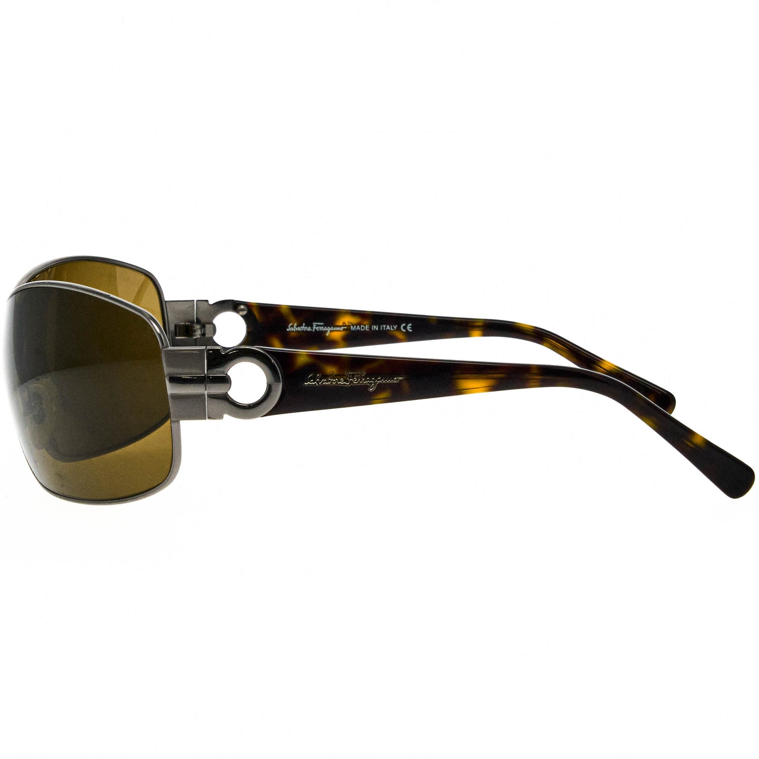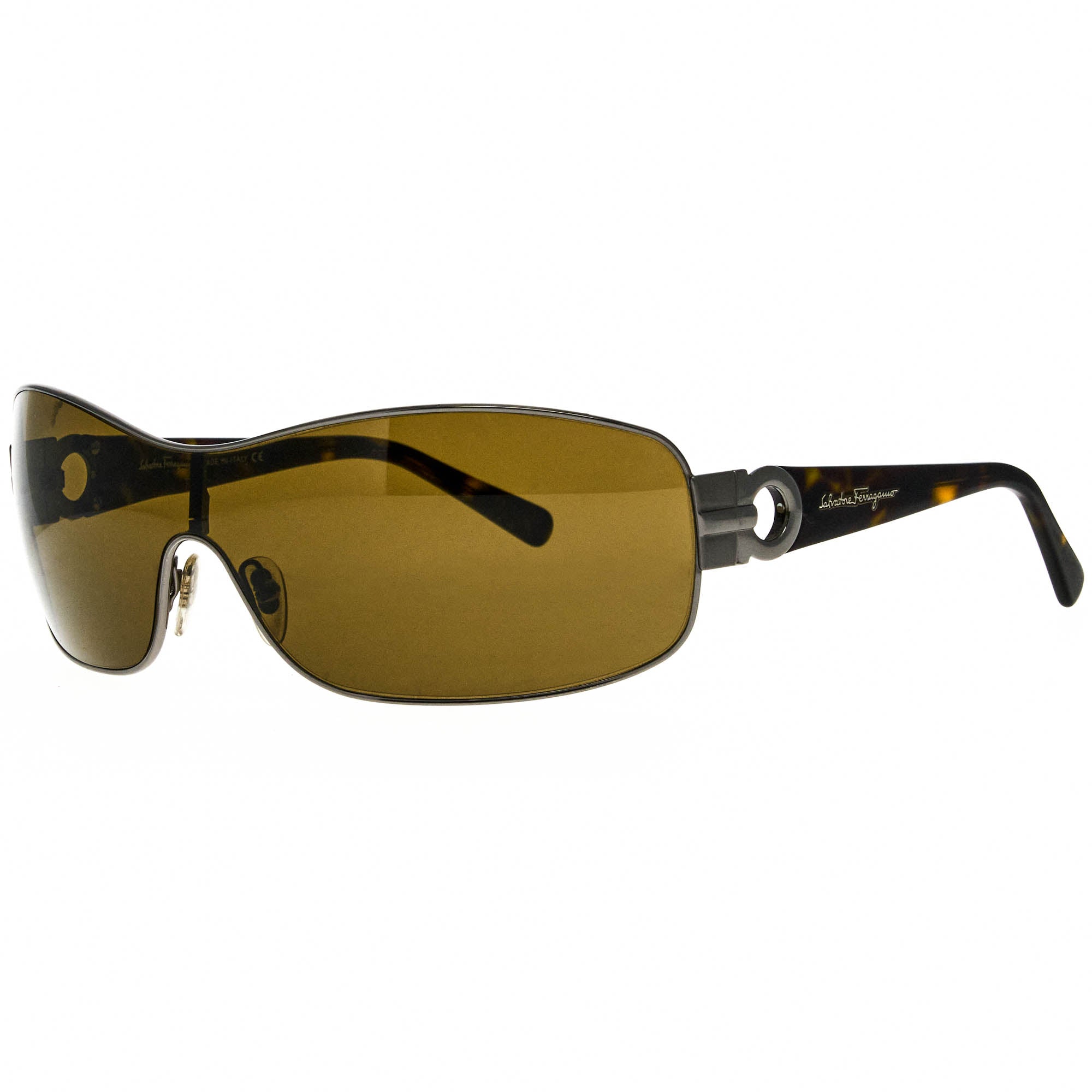 The Ferragamo 1101 502 73 120 vintage sunglasses, with its silver/brown frame and iconic shield silhouette, is a rare vintage sunglasses find for collectors.