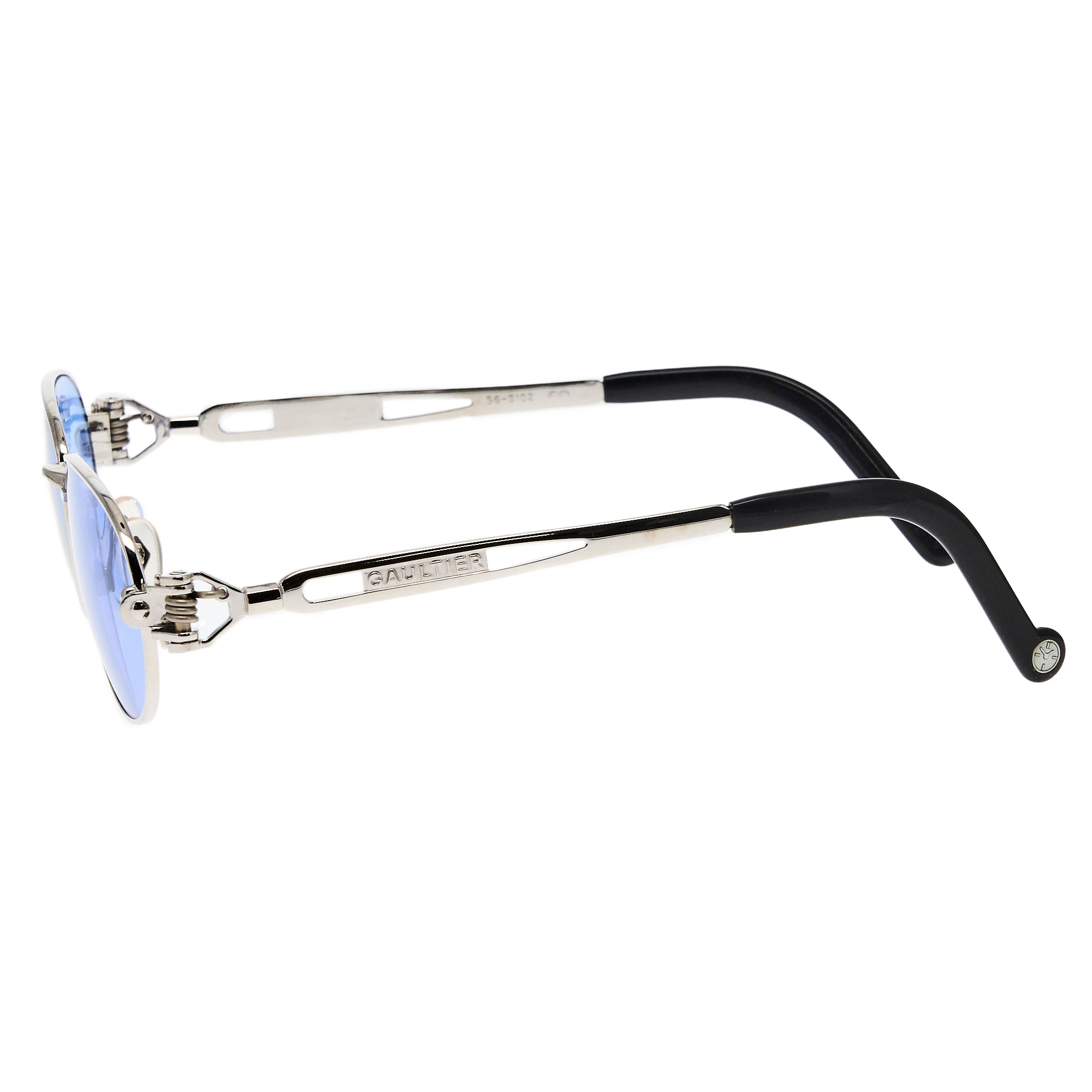 The Jean Paul Gaultier 56-8102 2 vintage sunglasses, featuring a silver frame and iconic oval silhouette, is a rare vintage sunglasses find for collectors.
