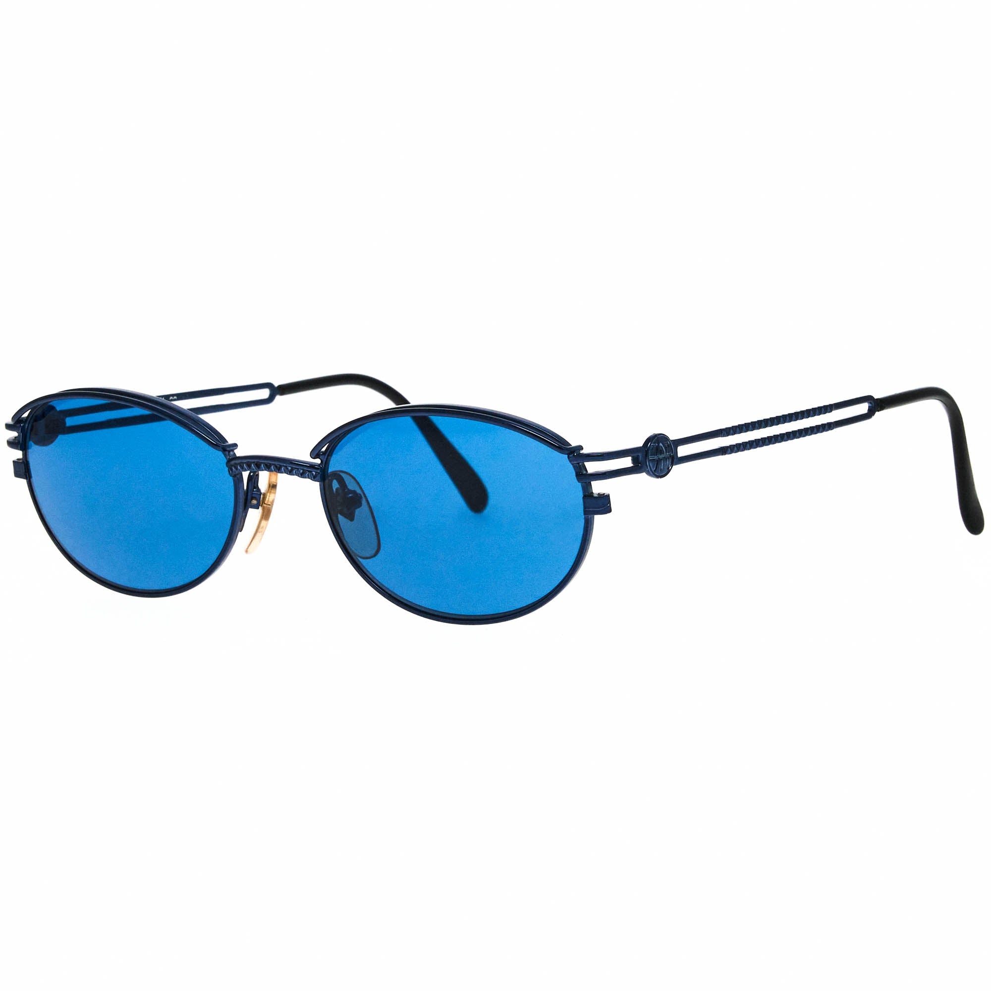 The Jean Paul Gaultier 58 6104 3 sunglasses, with its blue frame and iconic oval silhouette, is a rare vintage sunglasses find for collectors.