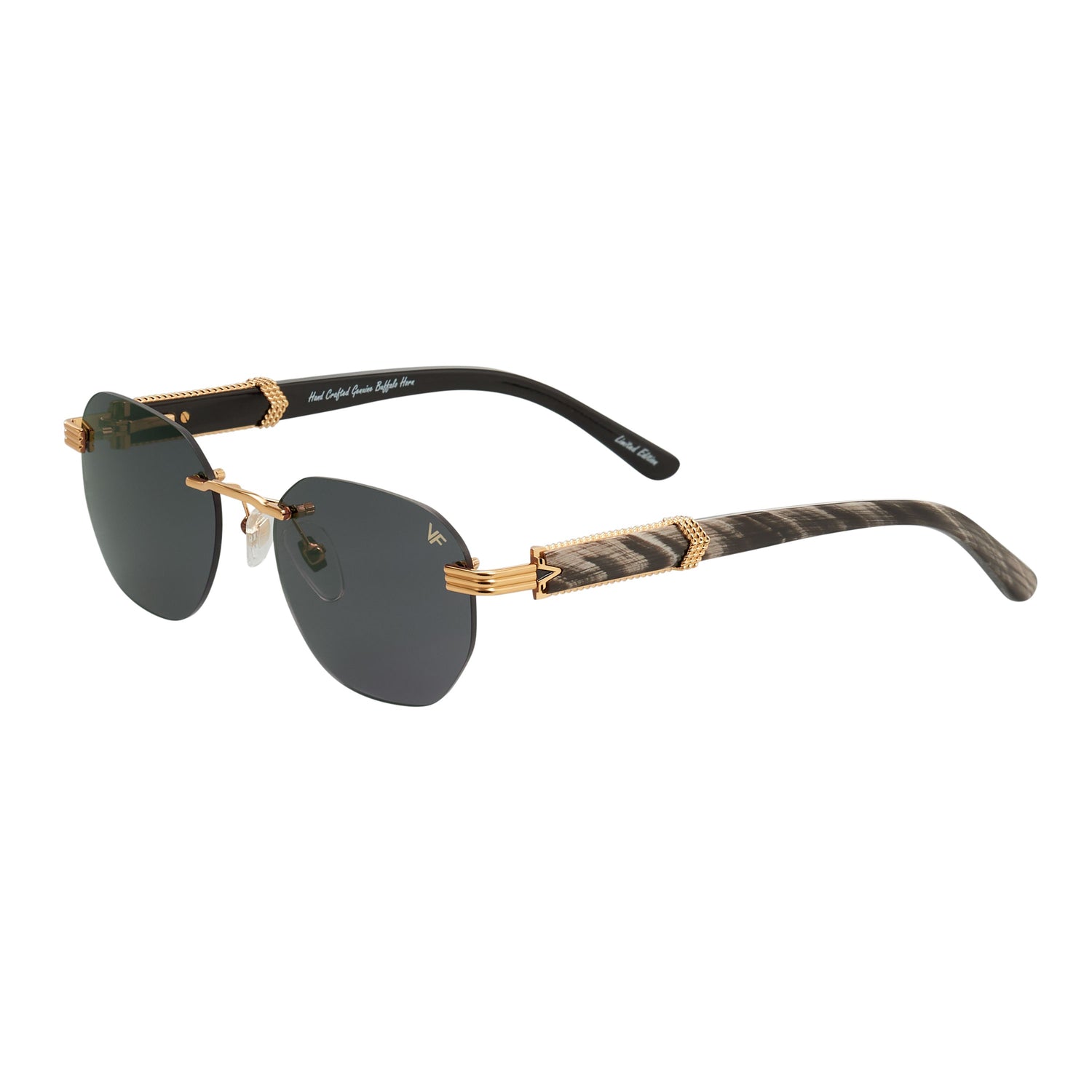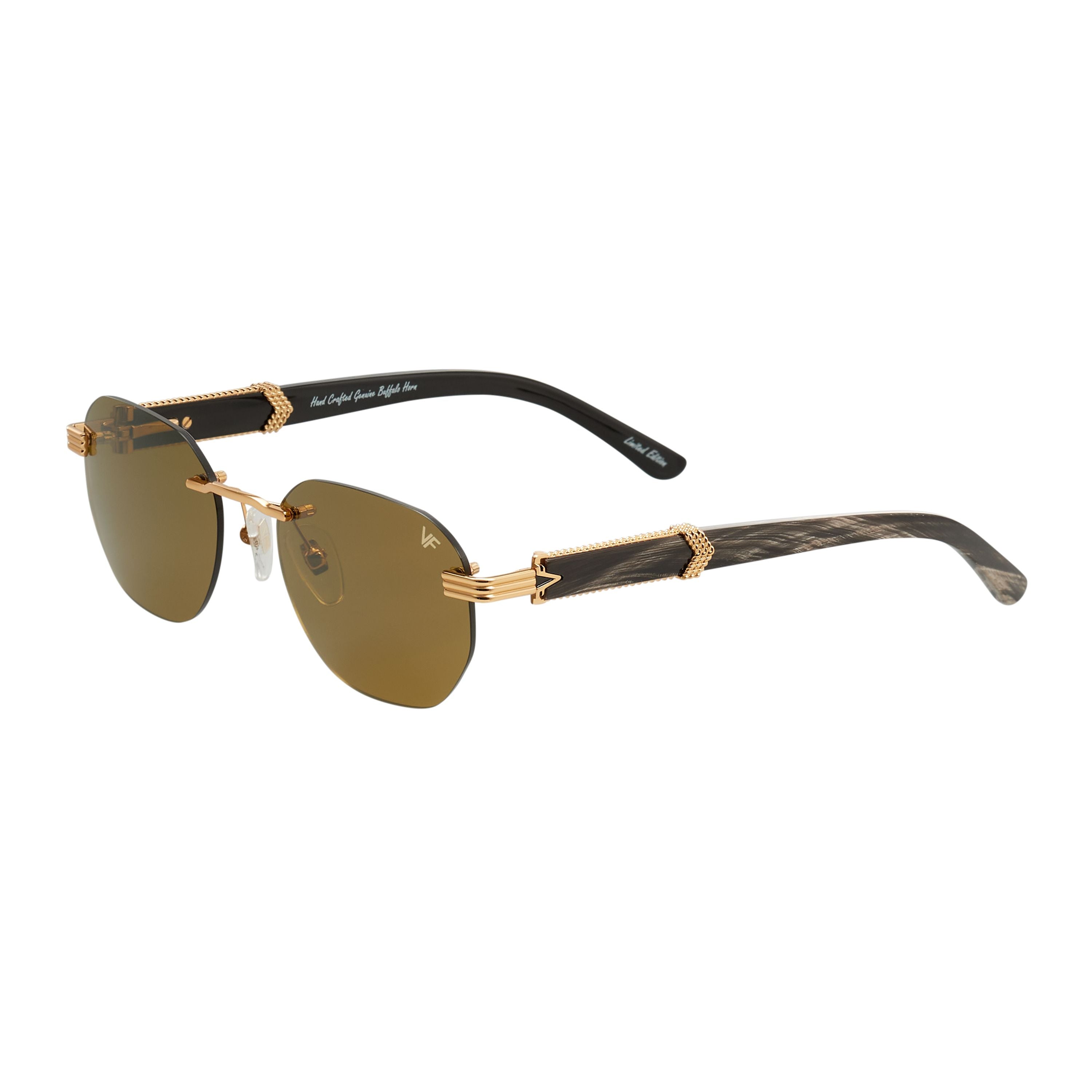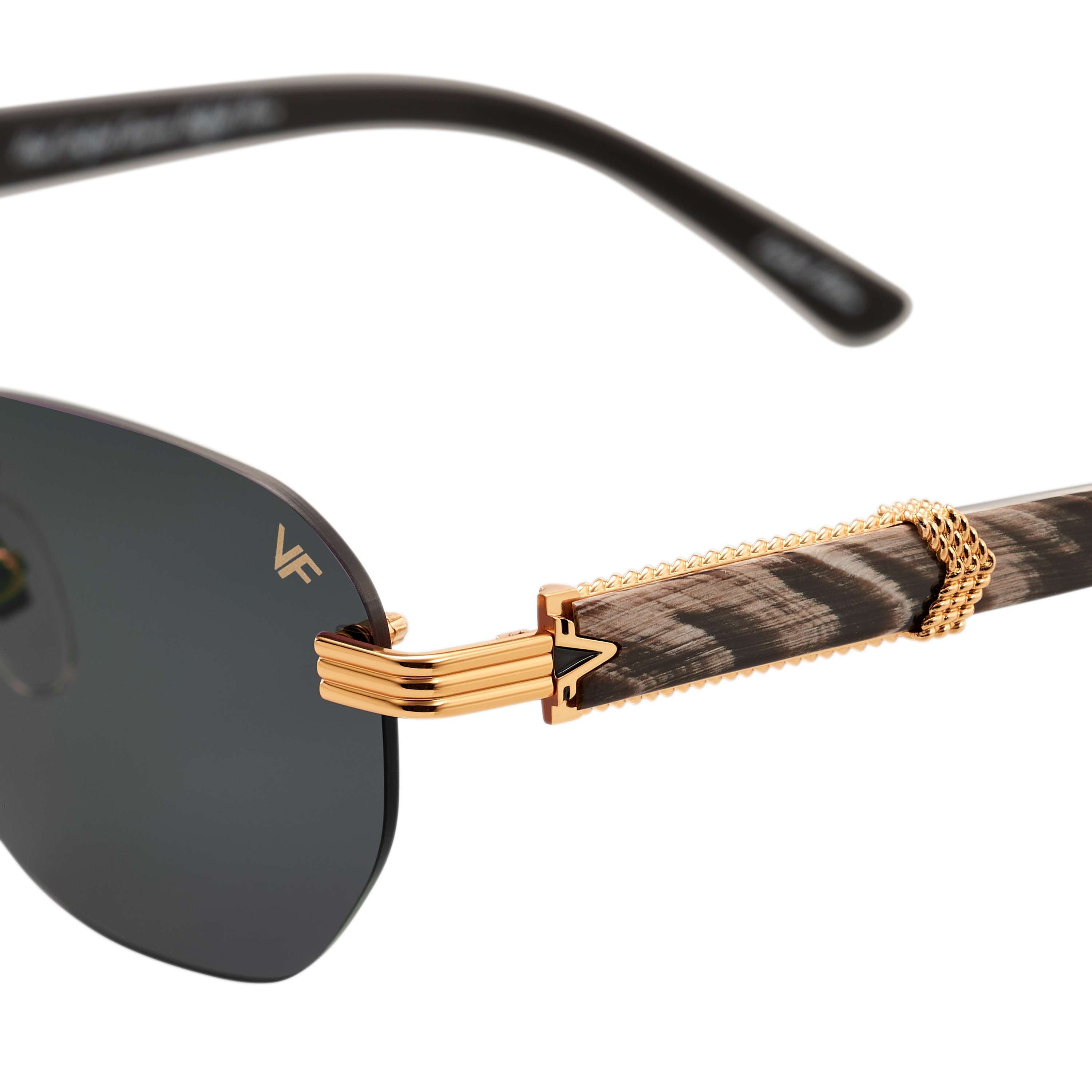 The VF Buffs are named after the street slang of buffalo horn glasses. Buffalo horn was the original material used in eyewear production in the 1940s and 50s. Our detroit player drill mount buffalo horn edition features arms made of sustainably source, genuine buffalo horn, reinforced with 24KT gold hardware. Each VF buff shows a unique pattern as they come from different horns and come in a video box telling the story behind the frame.