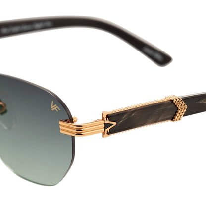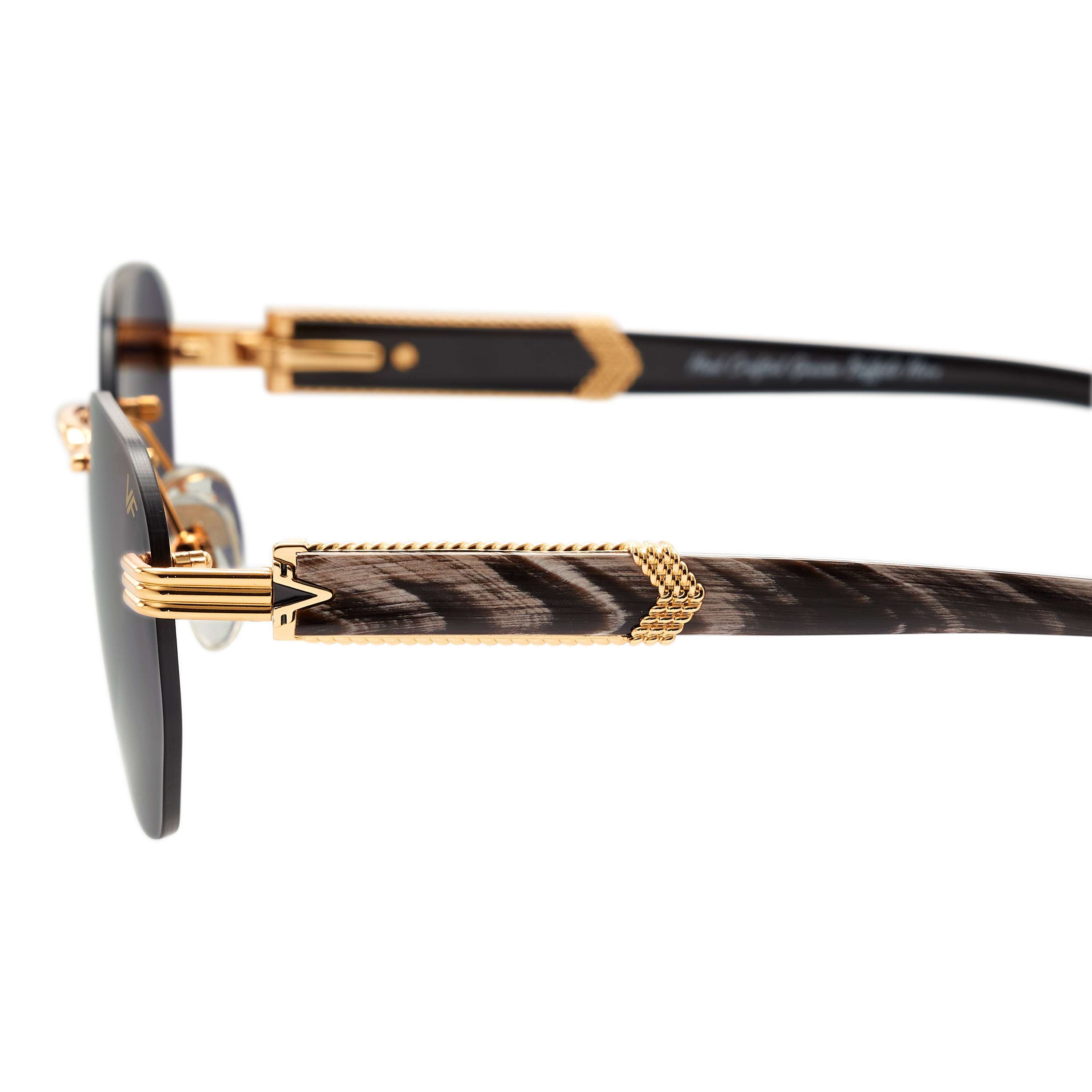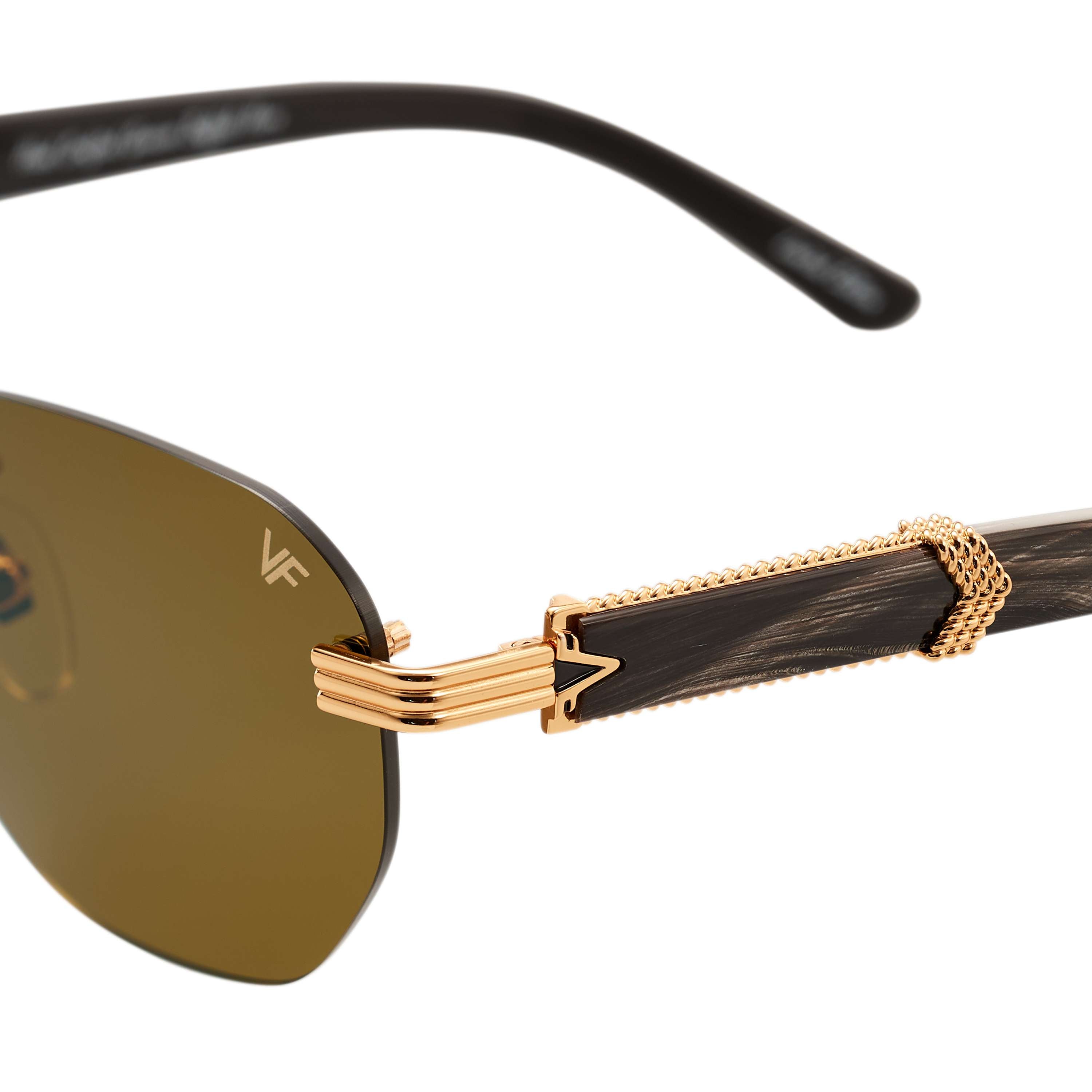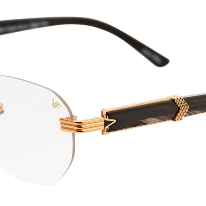 The VF Buffs are named after the street slang of buffalo horn glasses. Buffalo horn was the original material used in eyewear production in the 1940s and 50s. Our detroit player drill mount buffalo horn edition features arms made of sustainably source, genuine buffalo horn, reinforced with 24KT gold hardware. Each VF buff shows a unique pattern as they come from different horns and come in a video box telling the story behind the frame.
