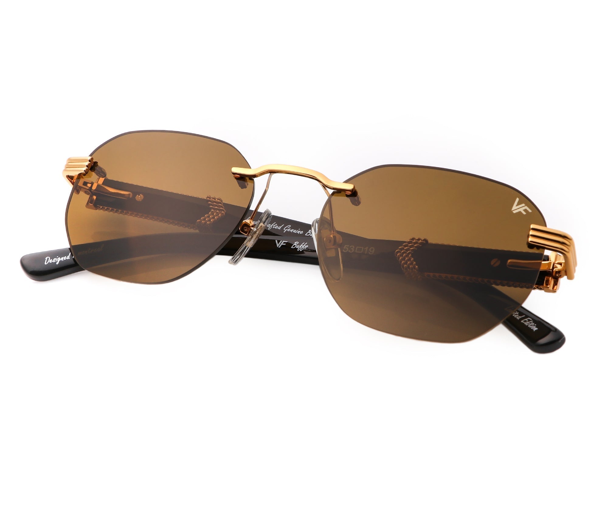 The VF Buffs are named after the street slang of buffalo horn glasses. Buffalo horn was the original material used in eyewear production in the 1940s and 50s. Our detroit player drill mount buffalo horn edition features arms made of sustainably source, genuine buffalo horn, reinforced with 24KT gold hardware. Each VF buff shows a unique pattern as they come from different horns and come in a video box telling the story behind the frame.
