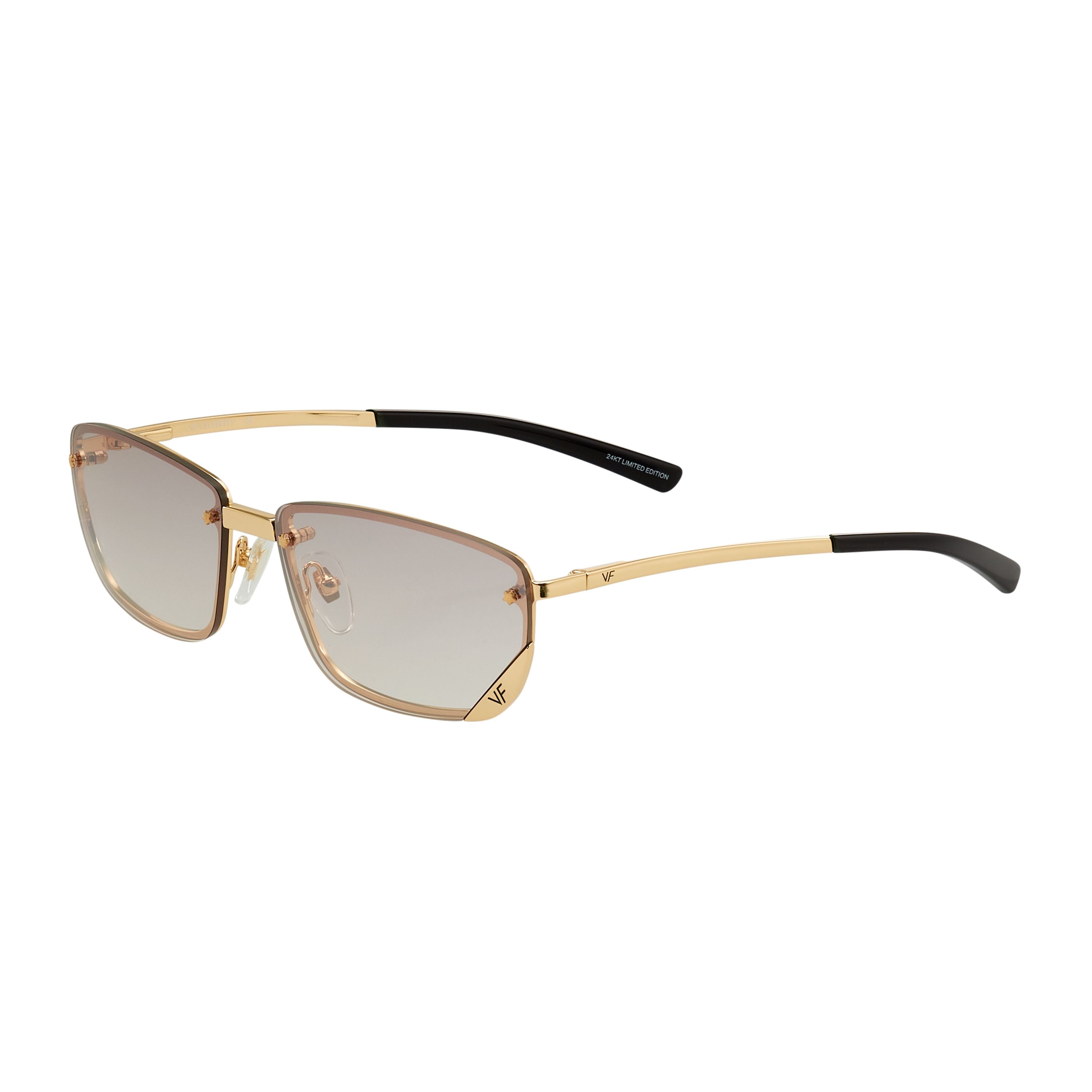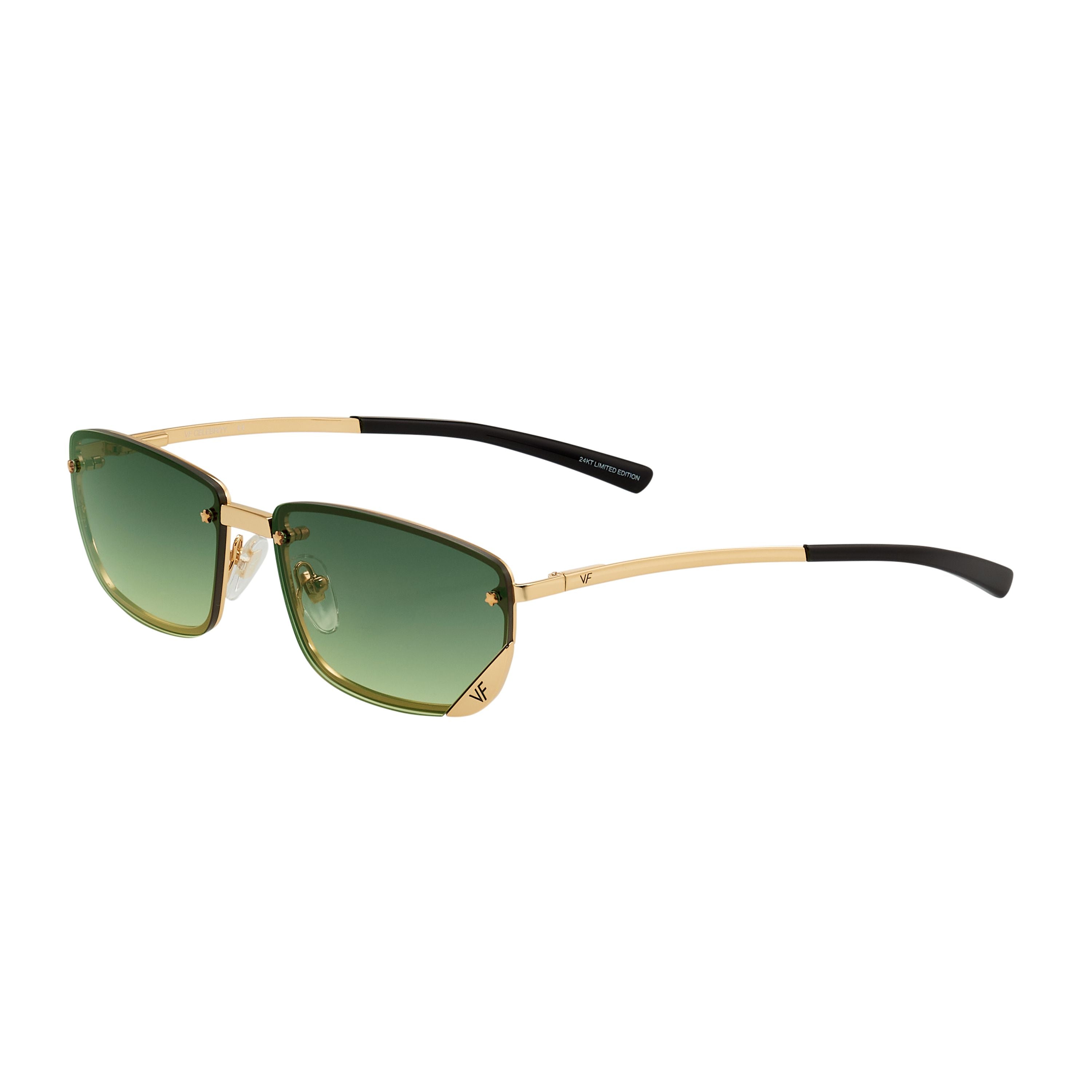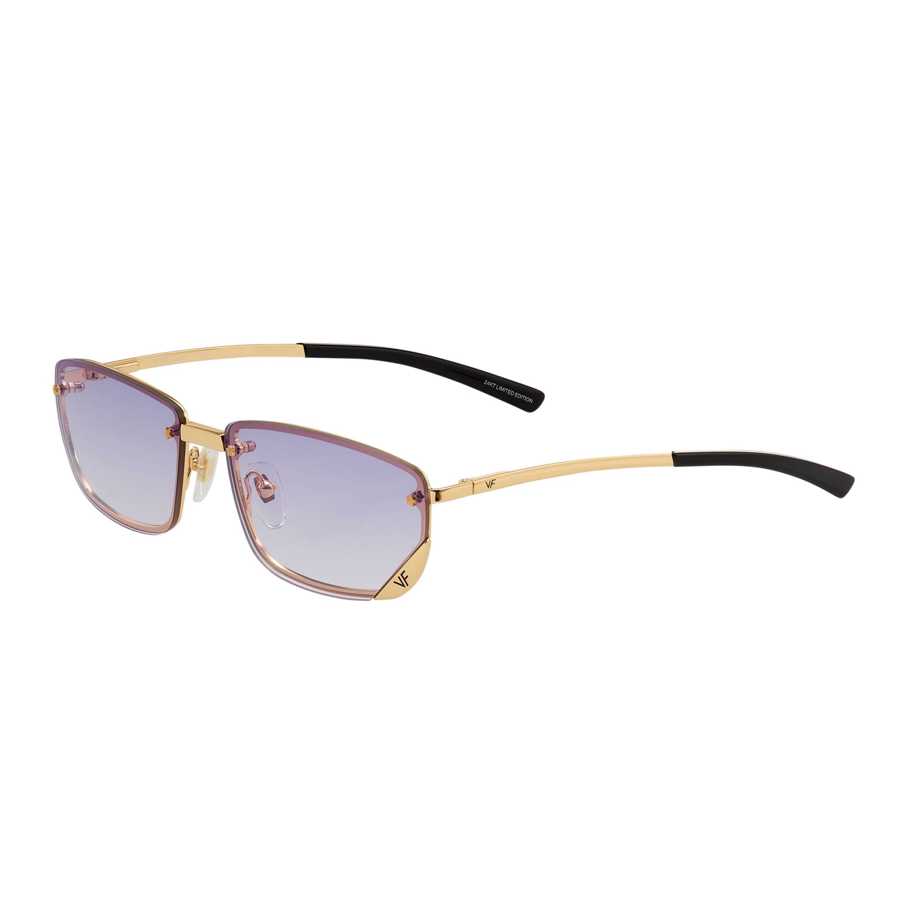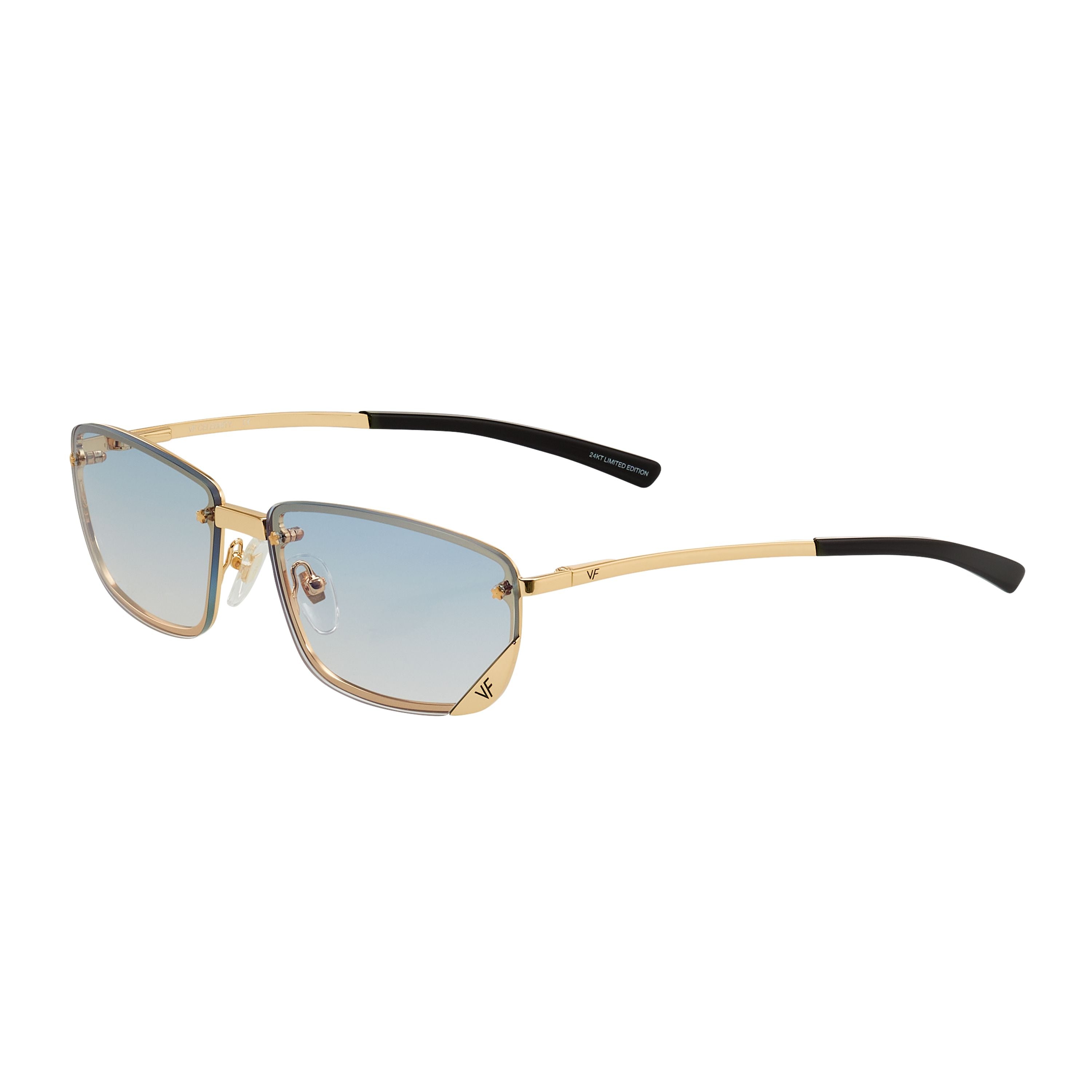 The VF Celebrity takes its inspiration from Y2K’s most influential fashion cues. The front loaded drill mount frame has been reinforced by a full backed rim giving each of the variety of lens pairings a different look. The 24kt yellow gold top loaded drop temple sets its construction apart from any other frame.