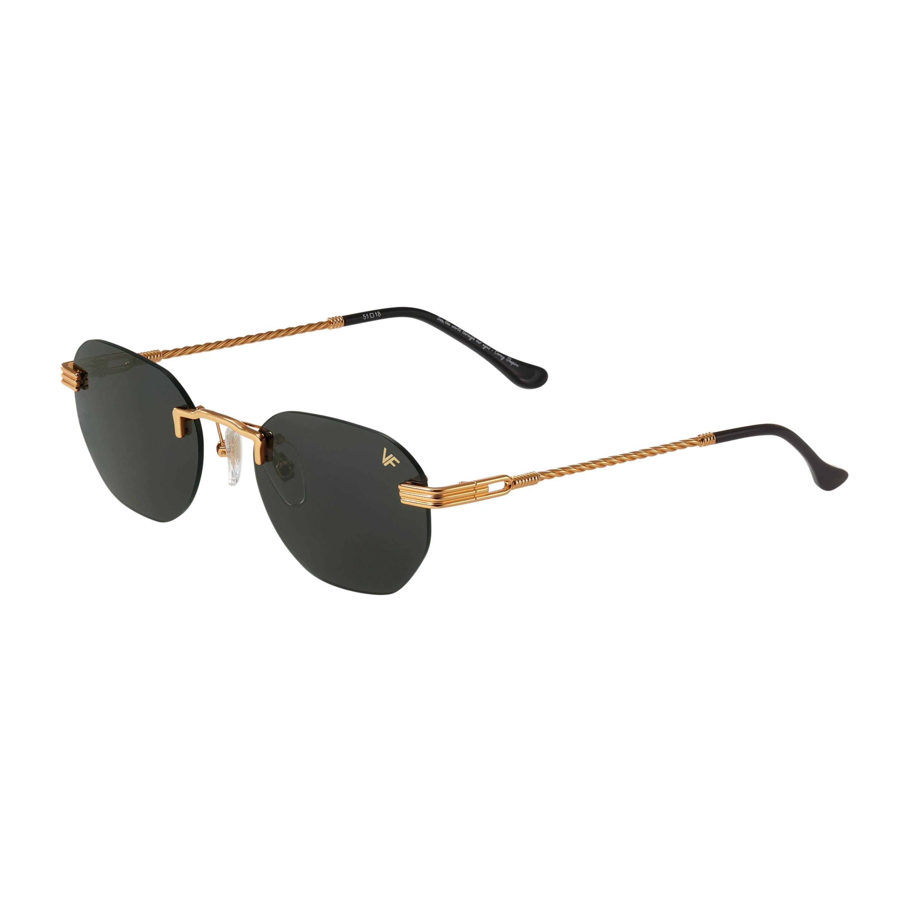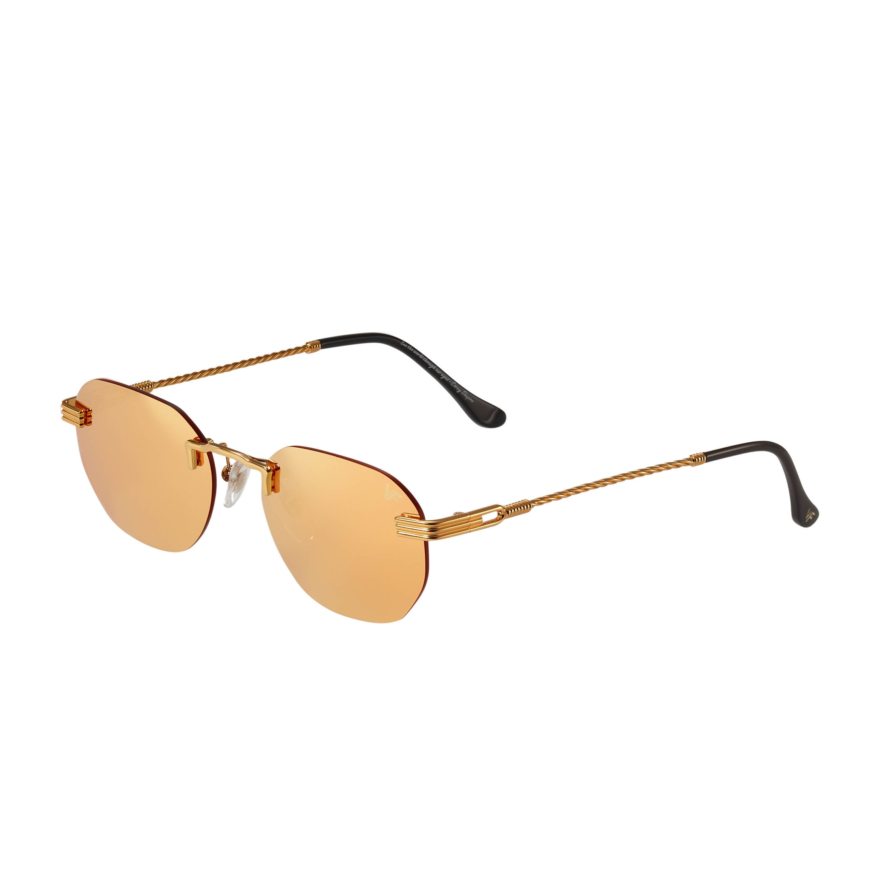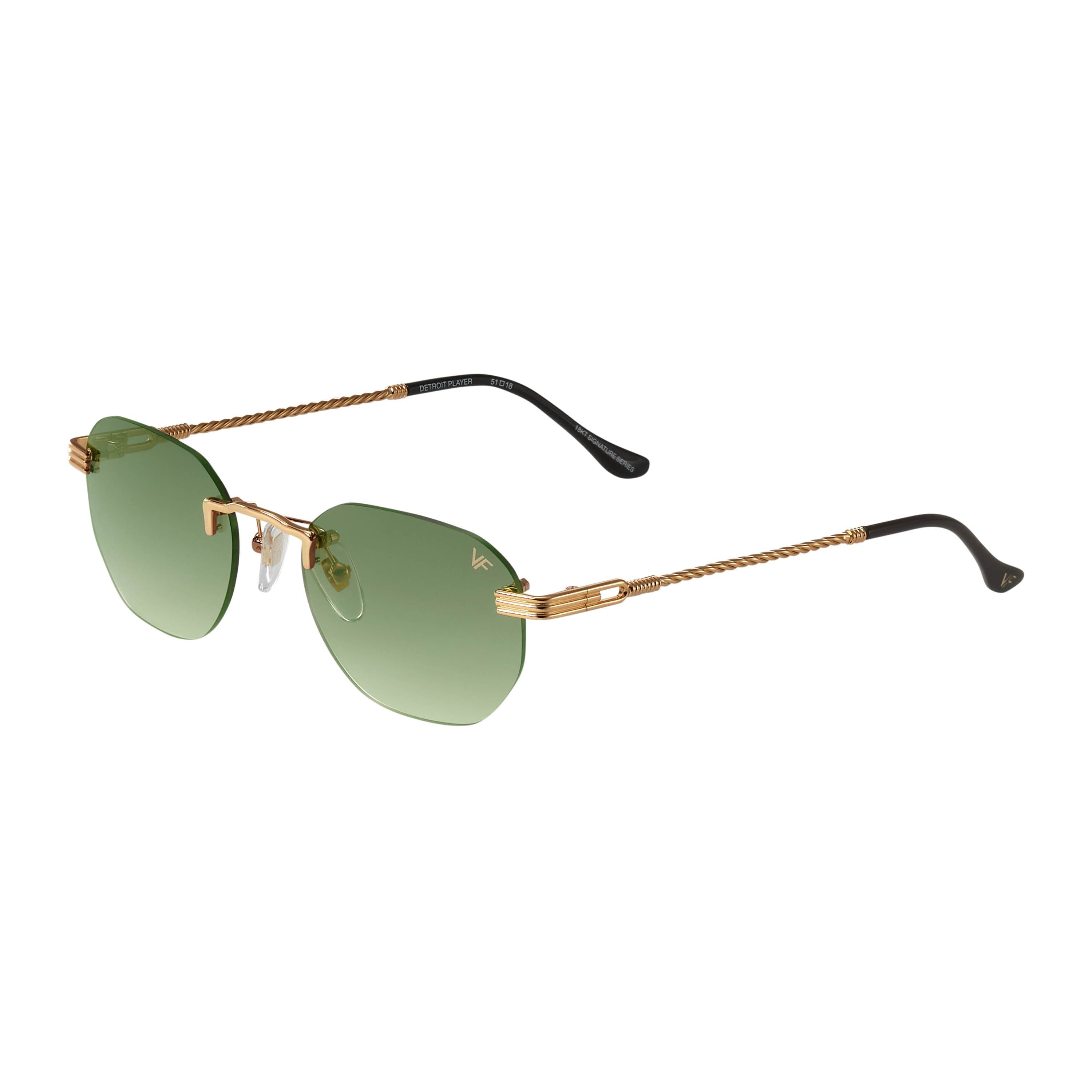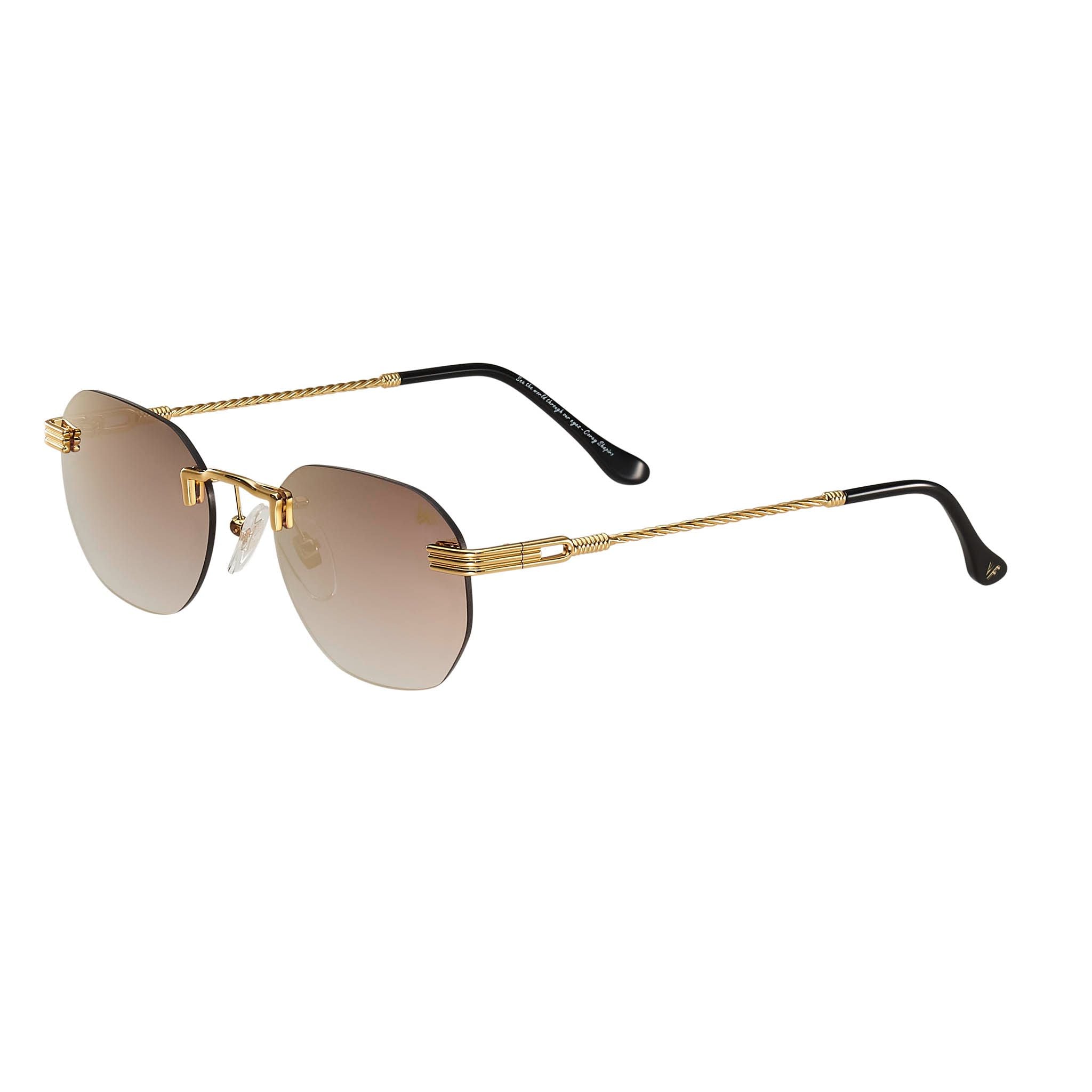 The fastest selling frame of all time is now available in a rimless style. The Detroit Player drill mount has 24kt gold nose bridge and our classic rope detailed arms. Available in an array of our iconic sun lenses and is also available for prescription.