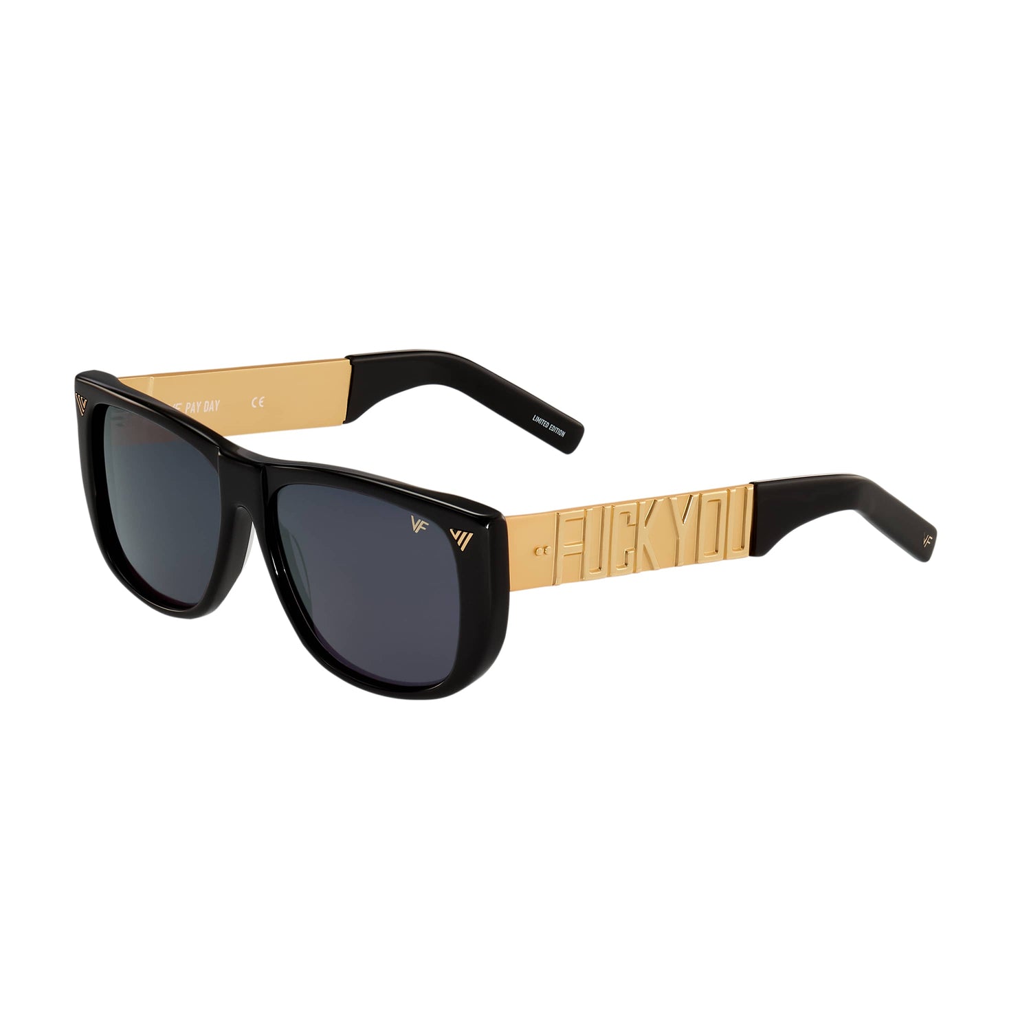 The Pay Day frame is a striking blend of timeless style and fearless attitude. With its classic black acetate silhouette and 24kt yellow gold weighted arms engraved with the bold phrases "Fuck You" and "Pay Me", these frames are designed to turn heads and make a statement. Perfect for those who value individuality and refinement, they offer both style and functionality—customizable for both optical and sun lenses to suit your needs. Durable, comfortable, and unapologetically bold, the VF Pay Day is more than eyewear; it’s a declaration of confidence and self-worth.